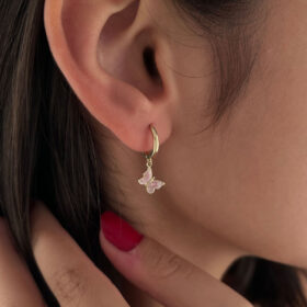 14 Ayar Altın Pembe Mineli Kelebek Halka Küpe