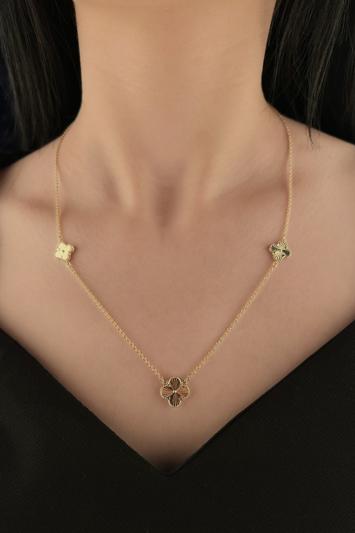 14 ayar altından üretilen, 7,26 gram ağırlığa ve 46 cm uzunluğa sahip üçlü şans yoncası kolye zarif, modern ve anlamlı bir tasarım sunar.