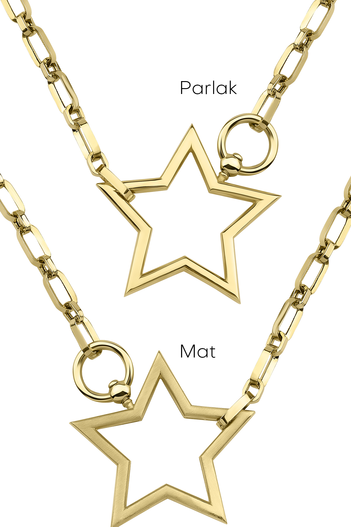 14 ayar altından İkra Kuyumculuk kalitesi ve işçiliği ile üretilen Asteria Işığı Kolye, kalın ve gösterişli bir zincir üzerinde yer alan büyük ve modern Yıldız (Asteria) figürüyle tasarlanmıştır. Zincir, 5,05 mm genişliğiyle dikkat çekerken, yıldız figürünün genişliği tam 4 cm‘dir. Bu kombinasyon, kolyeyi iddialı ve şık bir görünüm sunan bir statement parça haline getirir. Kolye, farklı uzunluk seçenekleriyle sunulmaktadır.