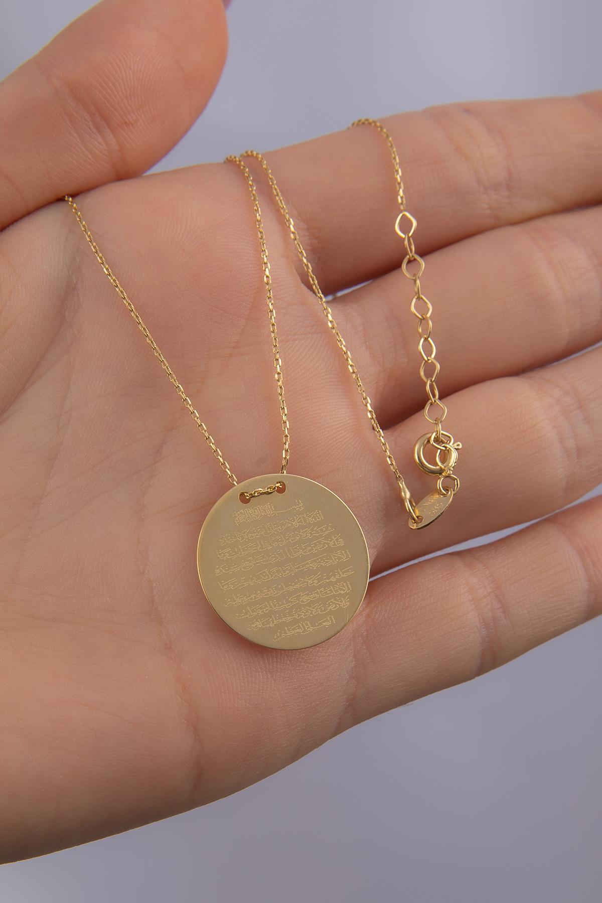 14 ayar altından İkra Kuyumculuk kalitesi ve işçiliği ile üretilen Ayetel Kürsi Yazılı Kolye, kolyenin ucu üzerinde Ayetel Kürsi‘nin zarif bir şekilde işlendiği, manevi değeri yüksek, özel bir tasarıma sahiptir. Kolye ucu 1,98 cm genişliğinde olup, detaylı işçiliğiyle dikkat çeker. Zincir, 39 cm ana uzunluğa ek olarak 3 cm uzatma halkası sayesinde ayarlanabilir bir kullanım sunar. Yaklaşık 2,52 gram ağırlığıyla günlük kullanıma uygun, ince ve anlamlı bir parçadır.