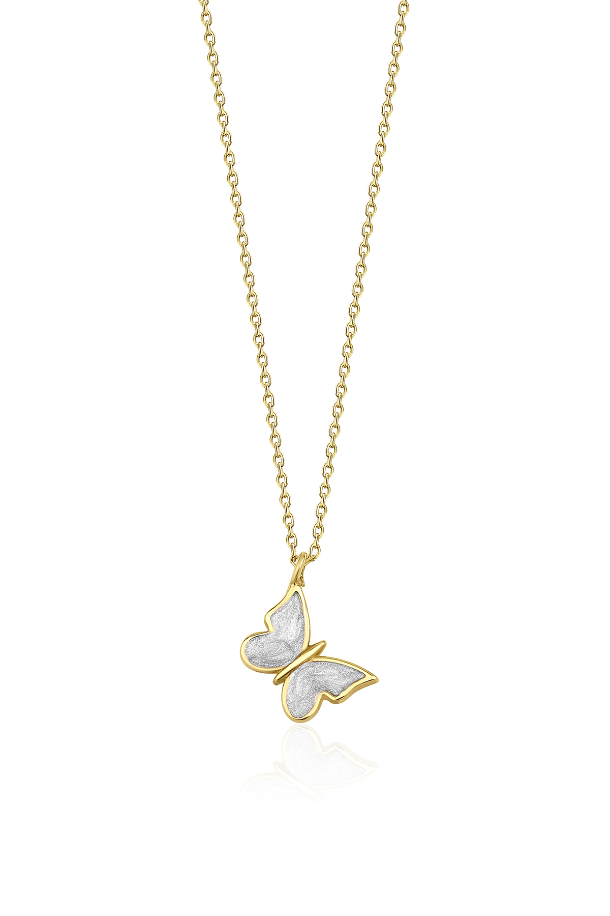 14 ayar altından üretilen, 1,51 gram ağırlığındaki ve 42 cm + 3 cm uzatma halkasına sahip beyaz mineli kelebek kolye zarif ve hafif bir tasarım sunar.