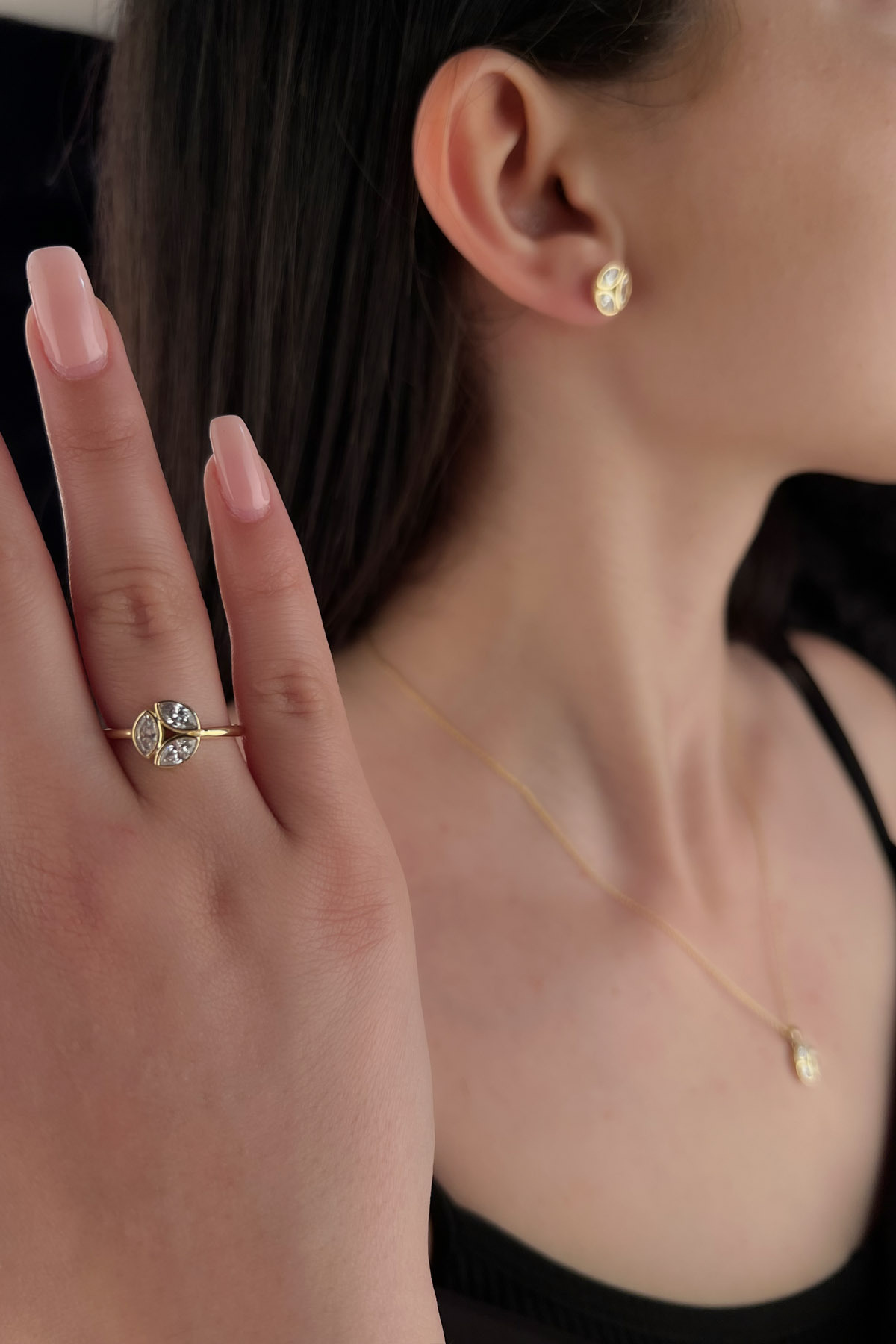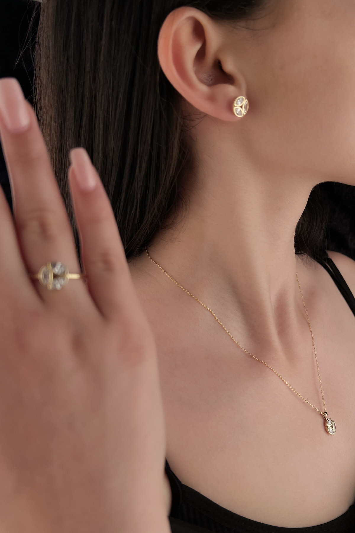 Toplam 8,17 gram ağırlığındaki bu şık set, kolye, küpe ve yüzük parçalarından oluşmaktadır. Zarif ve modern tasarımıyla hem günlük kullanımda hem de özel günlerde şıklığınızı tamamlar.