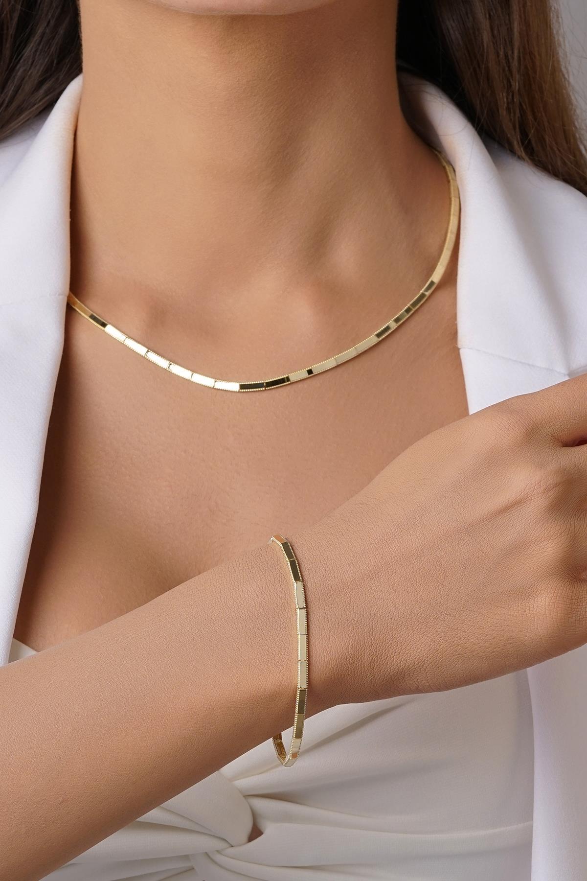 Kolye ve bileklikten oluşan set, toplam 19,33 gram ağırlığında, modern ve zarif tasarımıyla günlük kullanım ve hediye için ideal bir seçenektir.