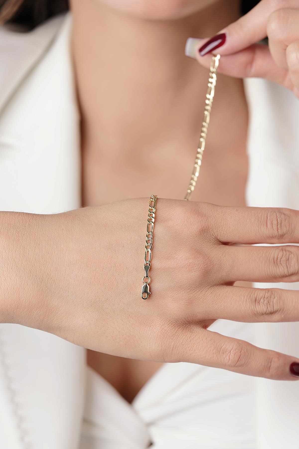 14 ayar altından İkra Kuyumculuk kalitesi ve işçiliği ile üretilen İnce Figaro Zincir Bileklik, bir uzun halka ve birkaç kısa halkanın art arda sıralanmasıyla oluşan klasik Figaro zincir modeline sahiptir. Zincir, 3,20 mm genişliğiyle günlük kullanıma uygun, parlak ve zarif bir kalınlıktadır.