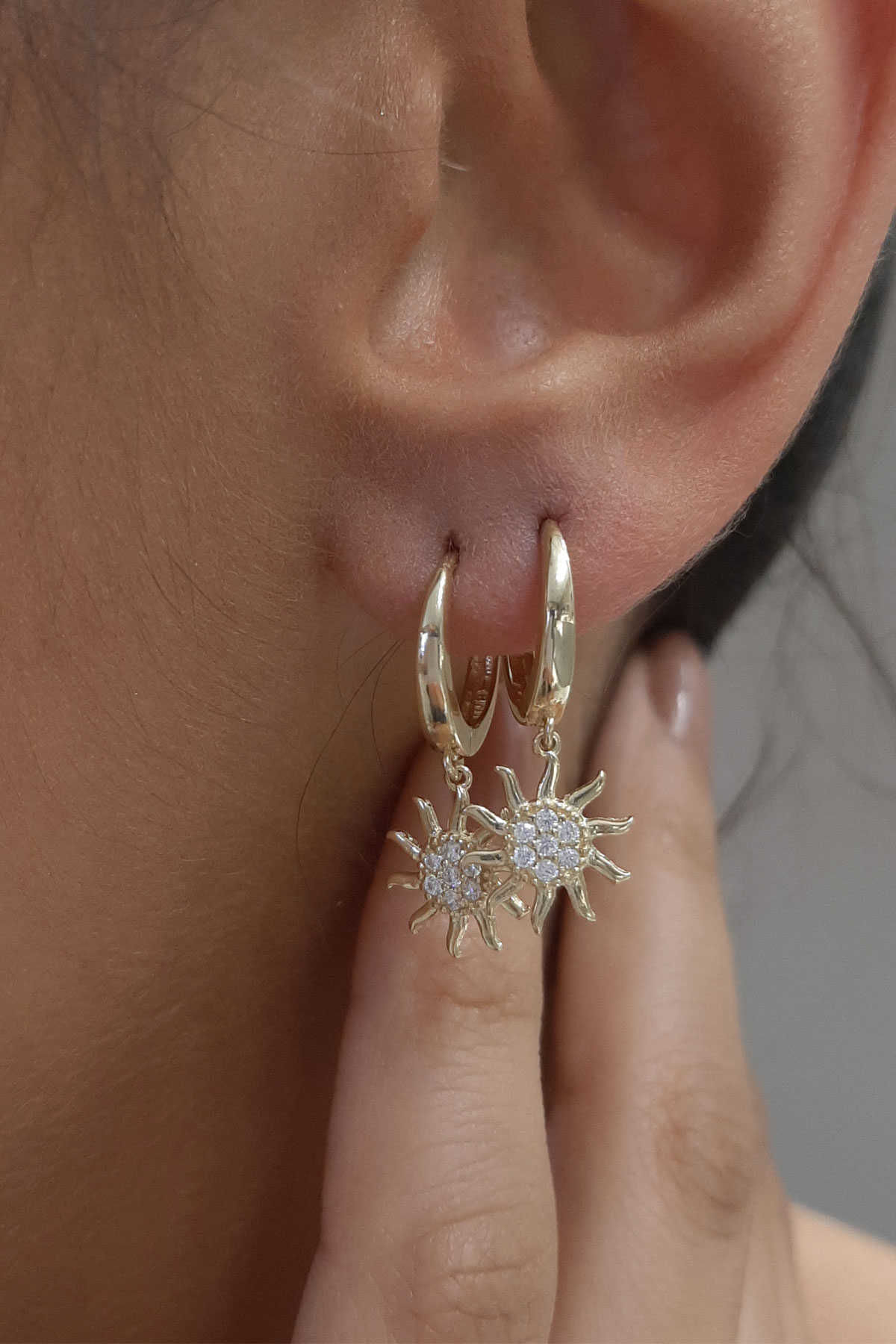 14 Ayar Altın güneş obje sallantılı küpe, ışığı her açıdan yansıtan zarif tasarımıyla modern stil kodlarını üst seviyeye taşır.