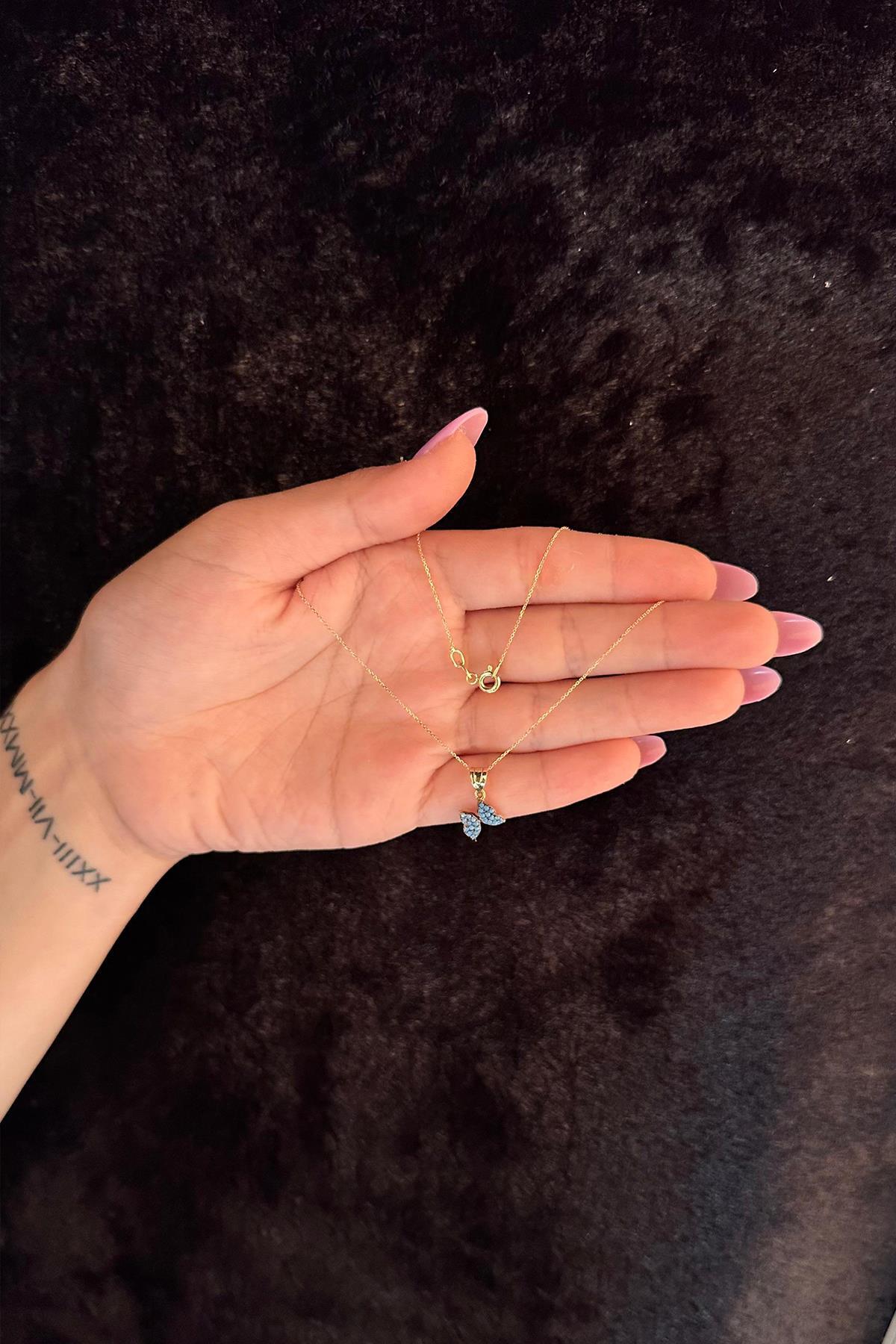 14 Ayar Altın Hayalet Zincir Firuze Taşlı Kelebek Kolye