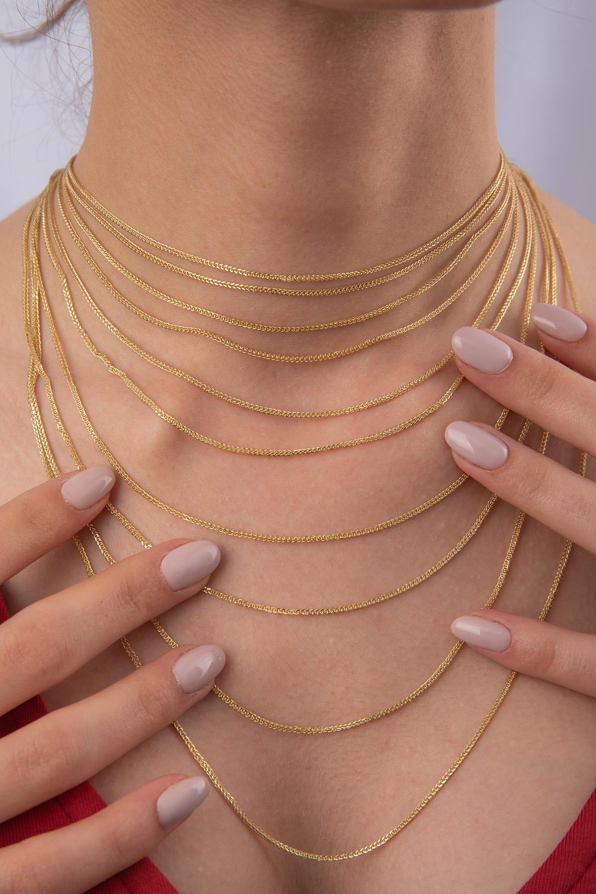 14 ayar altından üretilen İpek Zincir Kolye, 1,05 mm genişliğe sahiptir. Uzunluğa göre yaklaşık 1,48 gram ile 3,10 gram arasında değişen ağırlıktaki bu zarif zincir, 1 yıl garantilidir.