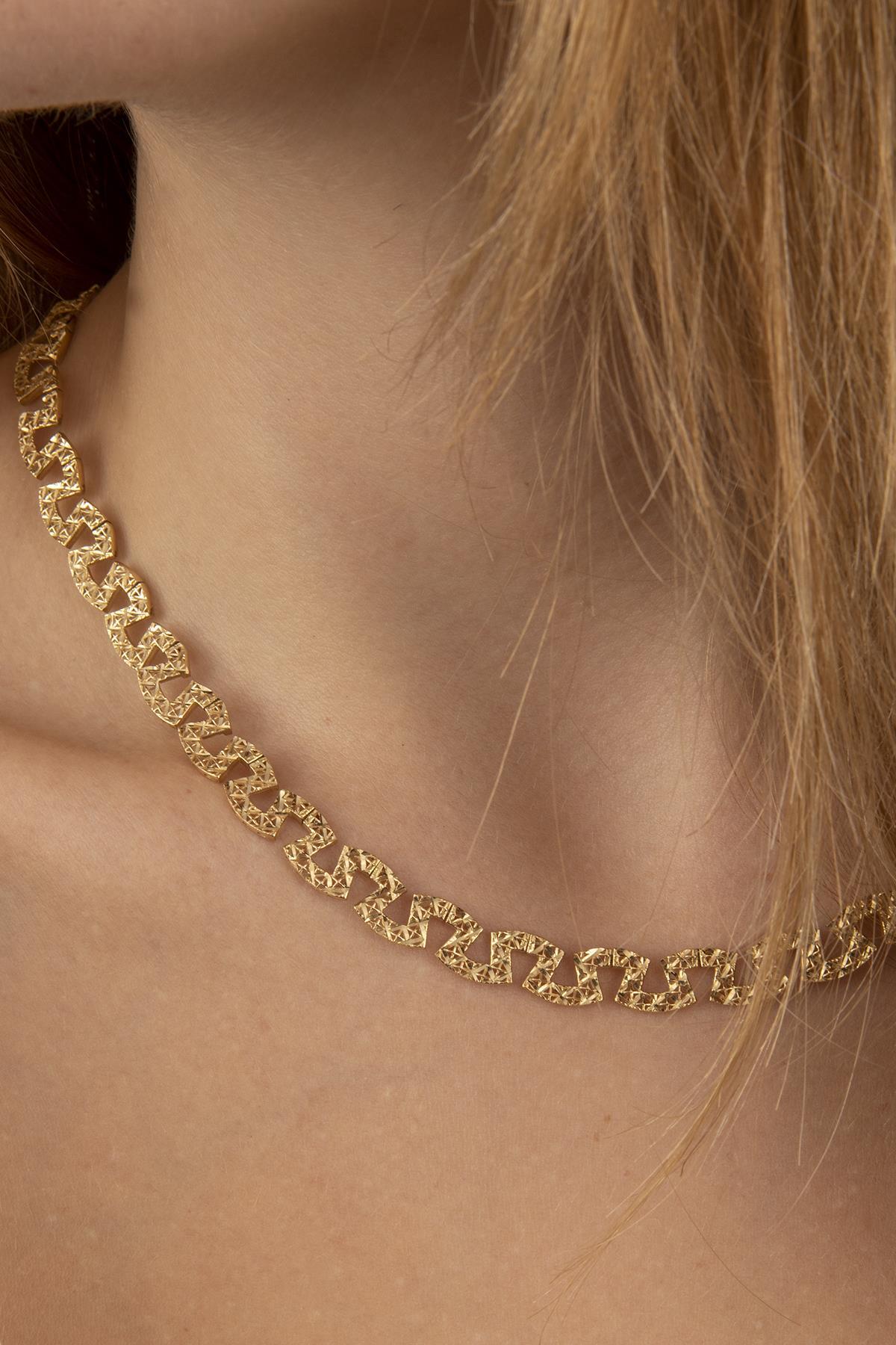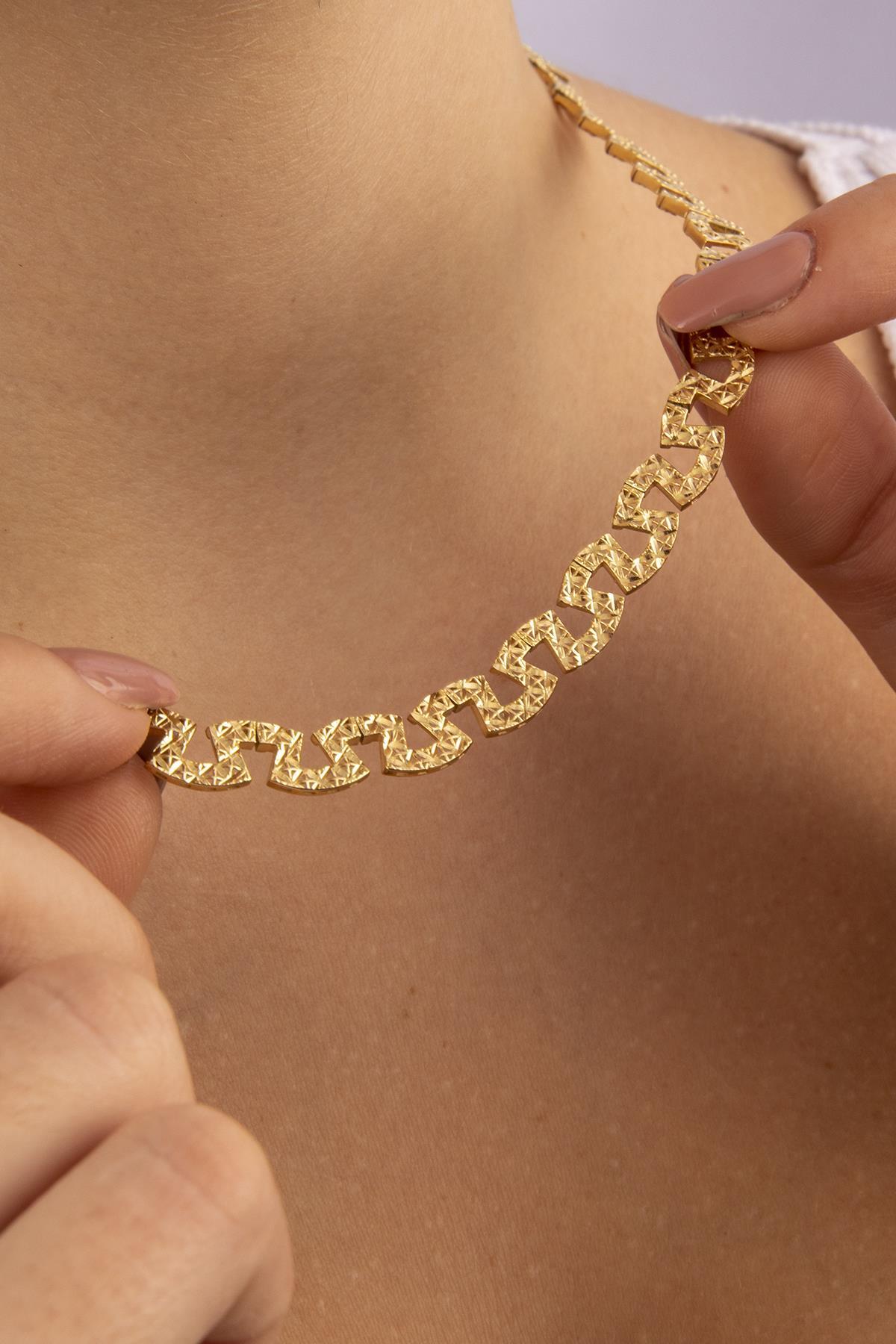 14 ayar altından İkra Kuyumculuk kalitesi ve işçiliği ile üretilen Işıltılı Greek Kolye, adını muhtemelen Yunan (Greek) motiflerinden veya özel bir zincir örgüsünden alan, yüzeyindeki ışıltılı kesimler sayesinde parlak ve göz alıcı, tok bir tasarımdır. Zincirin belirgin genişliği 7,60 mm‘dir. Kolye, 45 cm uzunluğunda olup, yaklaşık ağırlığı 15,51 gramdır ve gösterişli yapısıyla günlük kullanıma uygundur.