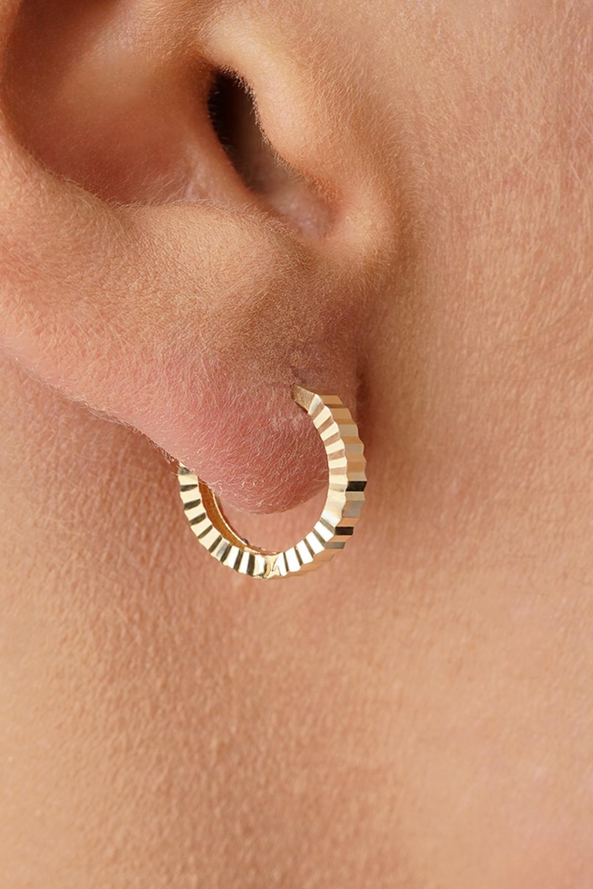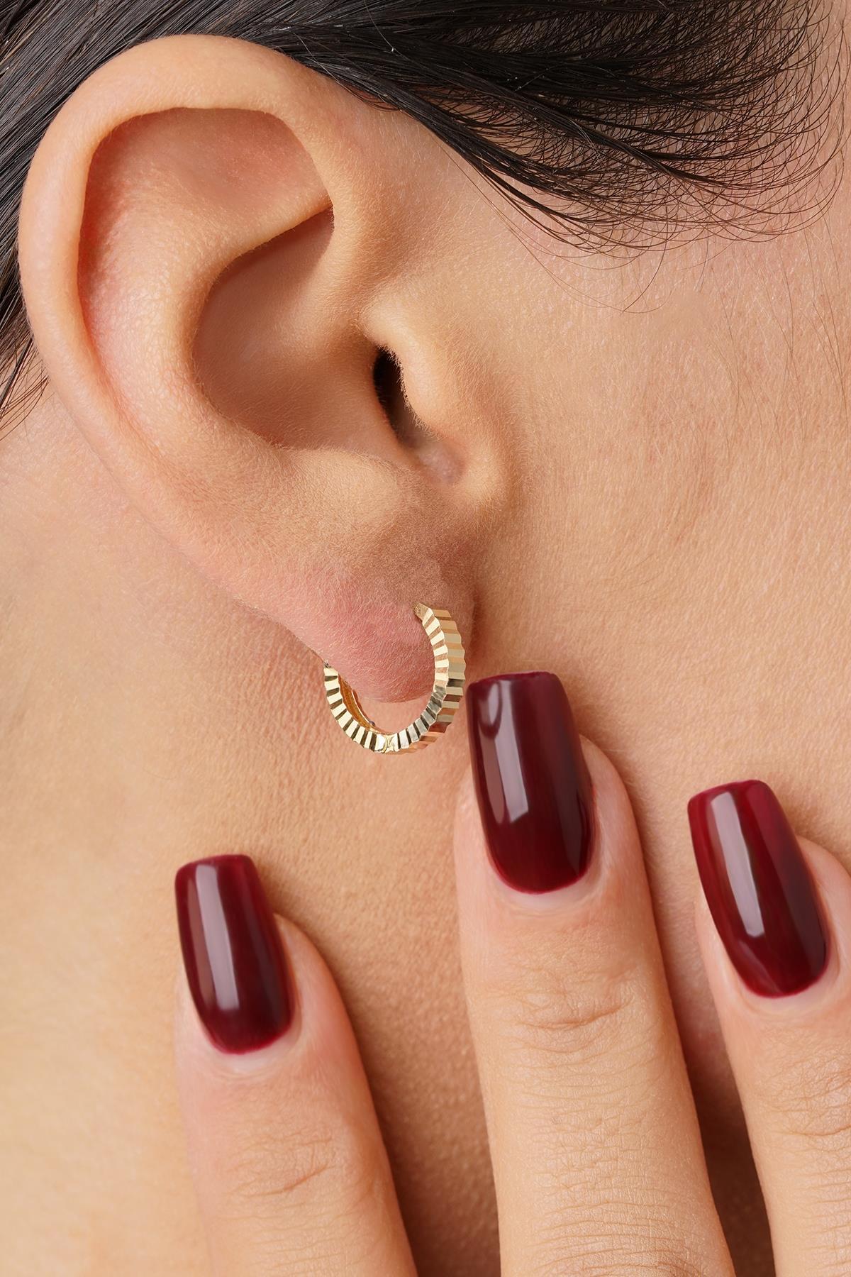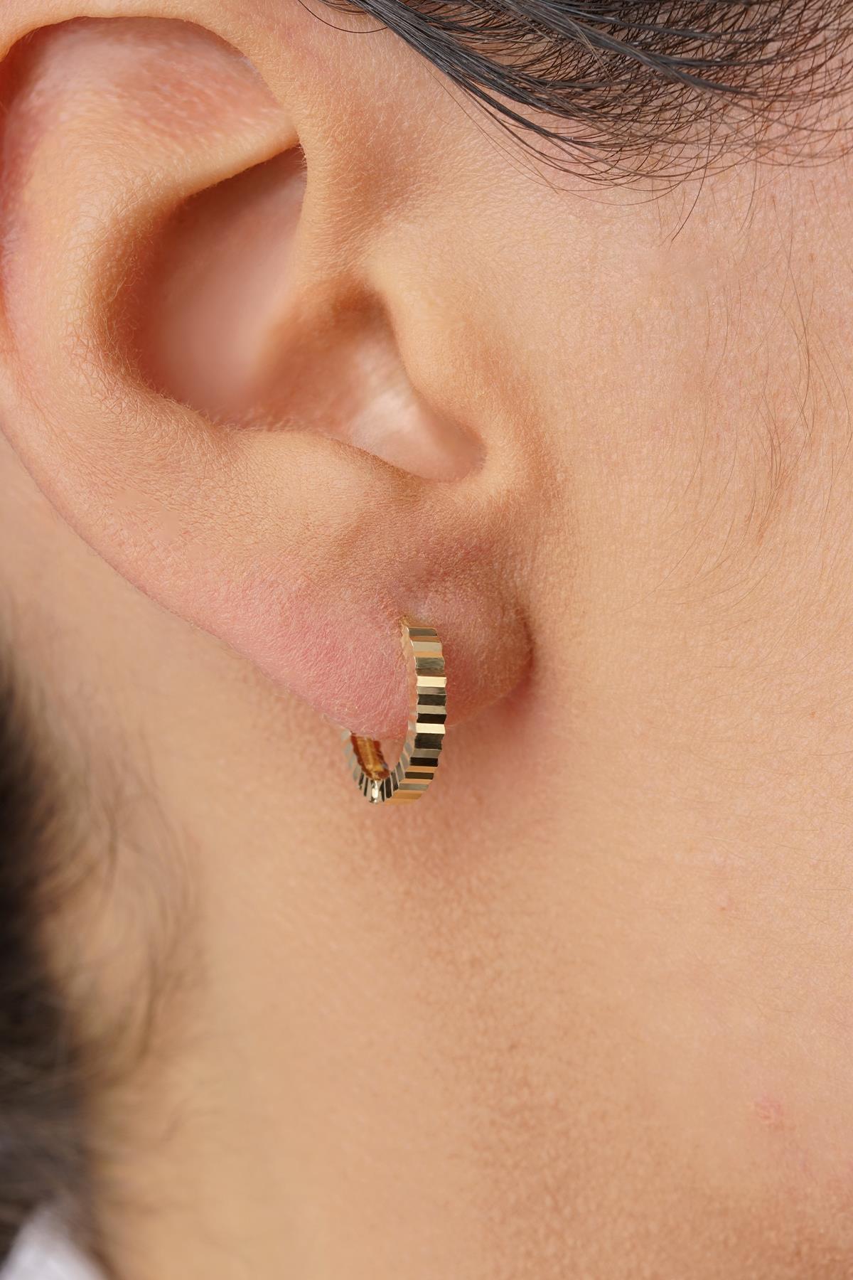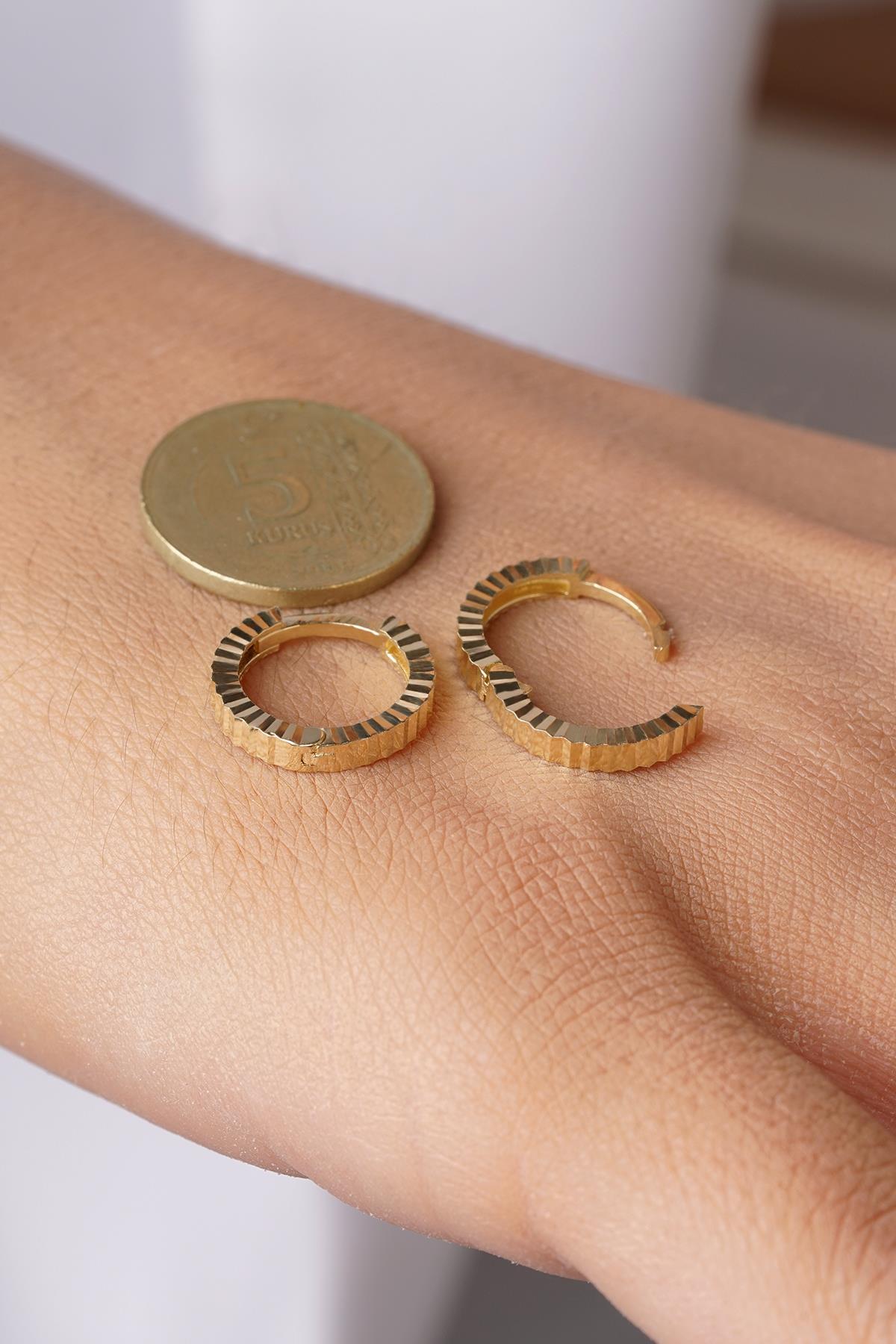 14 ayar altından İkra Kuyumculuk kalitesi ve işçiliği ile üretilen Kalem İşlemeli Işıltı Halka Küpe, mini halka formunda olup, yüzeyinde özel kalem (çizgi) işleme veya faset kesim detayları bulunur. Bu detaylar, küpeye ışığı yansıtan parlak ve ışıltılı bir görünüm katar. Mini boyutu (1,13 cm çap) ve zarif kalınlığı (1,90 mm) ile günlük kullanıma son derece uygundur. Ürünün yaklaşık çift ağırlığı 1,38 gramdır. Tüm küpe modellerimiz çift olarak gönderilmektedir.