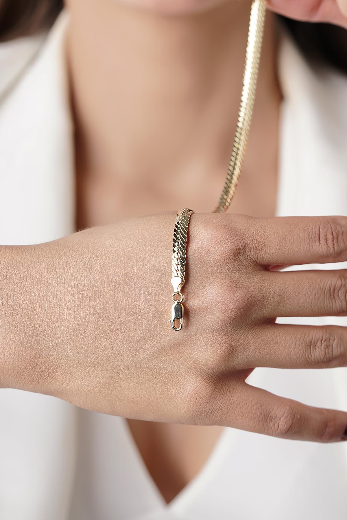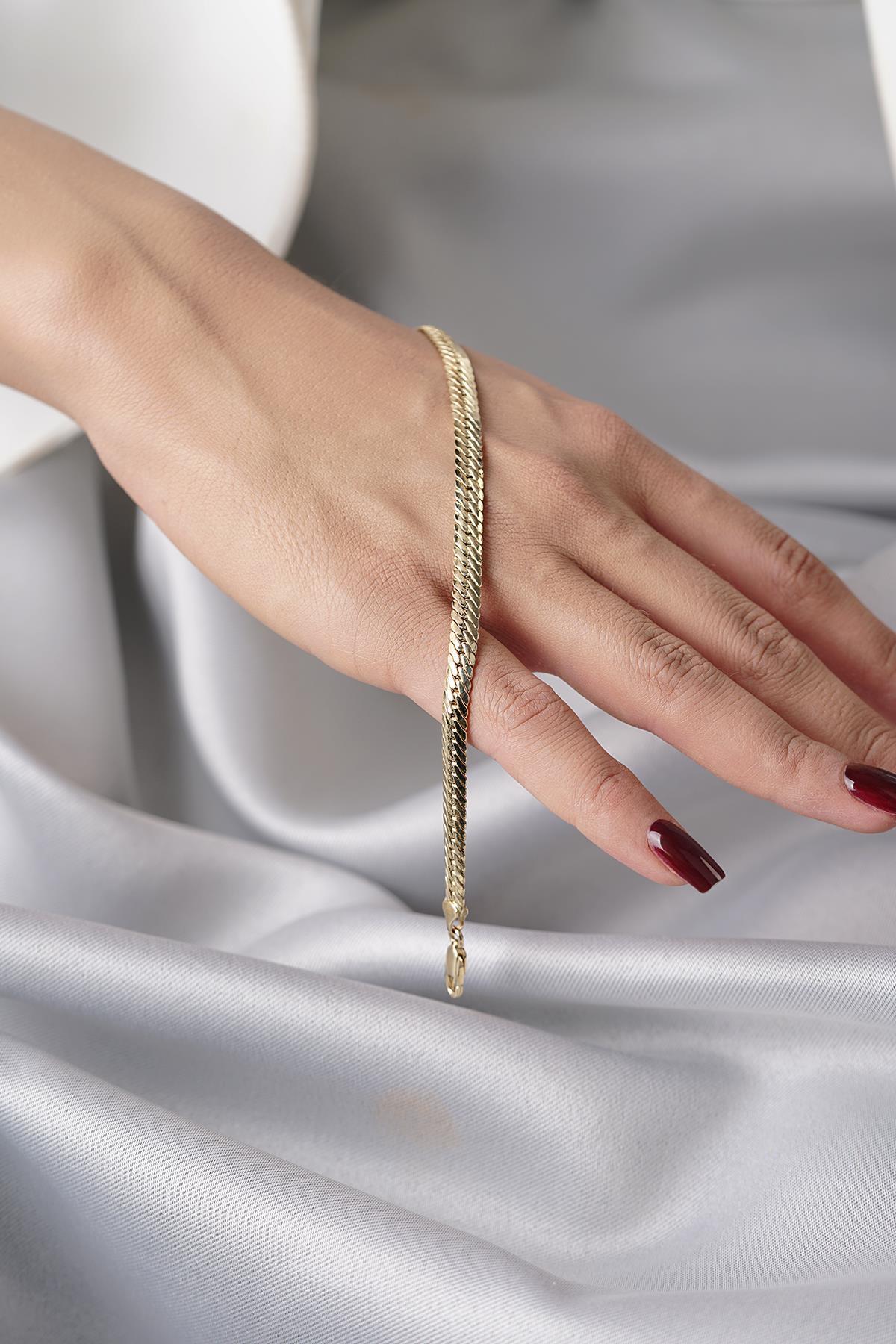 14 ayar altından İkra Kuyumculuk kalitesi ve işçiliği ile üretilen Kalın Balıksırtı Bileklik, parlak, akışkan ve tok yapısıyla modern bir görünüm sunan klasik balıksırtı (herringbone) zincir modelidir. Bilekliğin genişliği 5,15 mm ve toplam uzunluğu 20 cm‘dir. Yaklaşık 5,80 gram ağırlığıyla dikkat çekici ve günlük kullanıma uygun bir parçadır. Belirtilen ağırlıkta (+/-) %10 değişiklik gösterebilir.