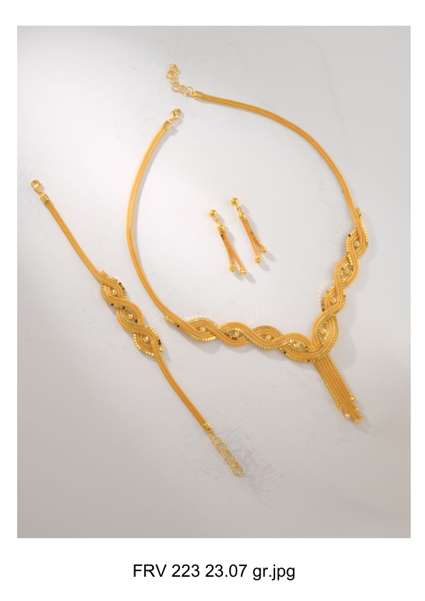 14 Ayar Altın Kalze Set – 23.07 gram ağırlığında, kolye, bileklik ve küpeden oluşan şık bir takı setidir. Ultralight kalze tekniğiyle üretilen bu set, hem günlük kullanıma hem de özel günlere, düğün ve nişan törenlerine uygundur.
