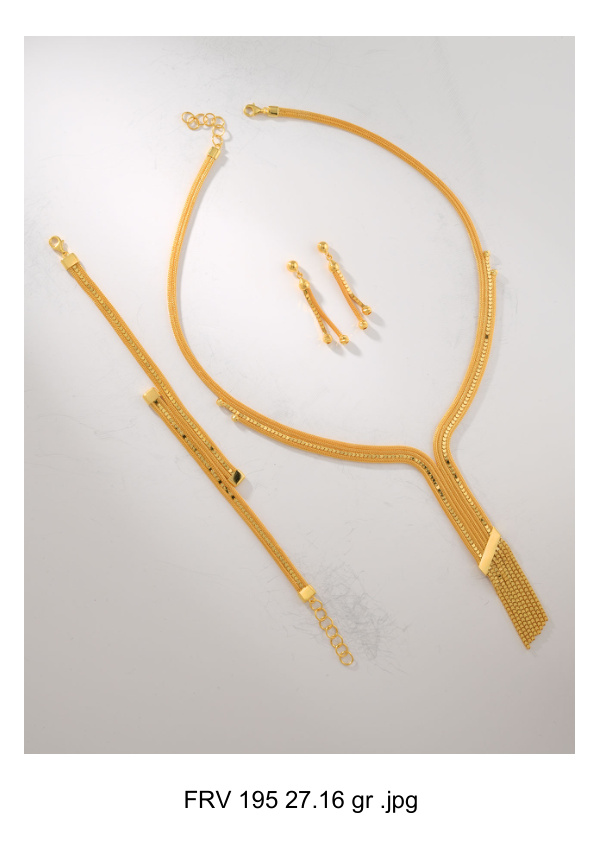 14 ayar altın kalze set, 27.16 gr. Kolye, bileklik ve küpe içerir. Ürün kodu: FRV195.