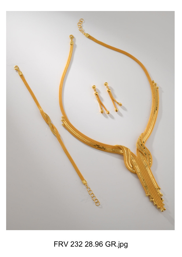 14 Ayar Altın Kalze Set – 28.96 gram ağırlığında, kolye, bileklik ve küpeden oluşan şık bir takı setidir. Ultralight kalze tekniğiyle üretilen bu set, hem günlük kullanıma hem de özel günlere, düğün ve nişan törenlerine uygundur.