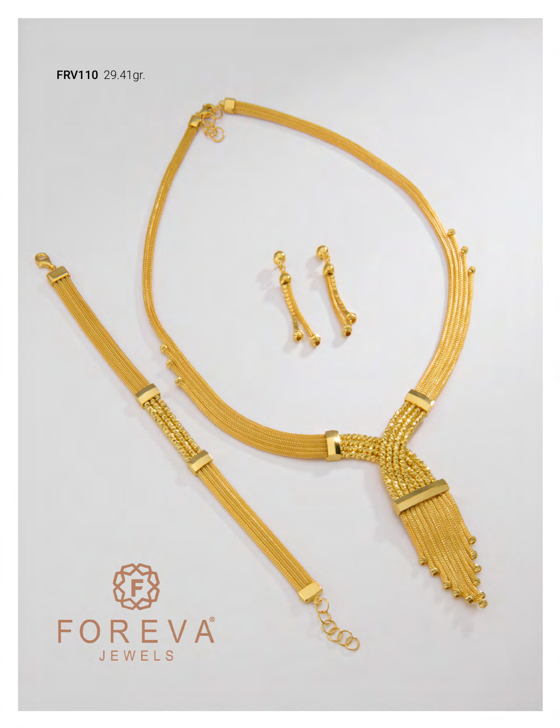 14 ayar altın kalze set, 29.41 gr. Kolye, bileklik ve küpe içerir. Ürün kodu: FRV110.