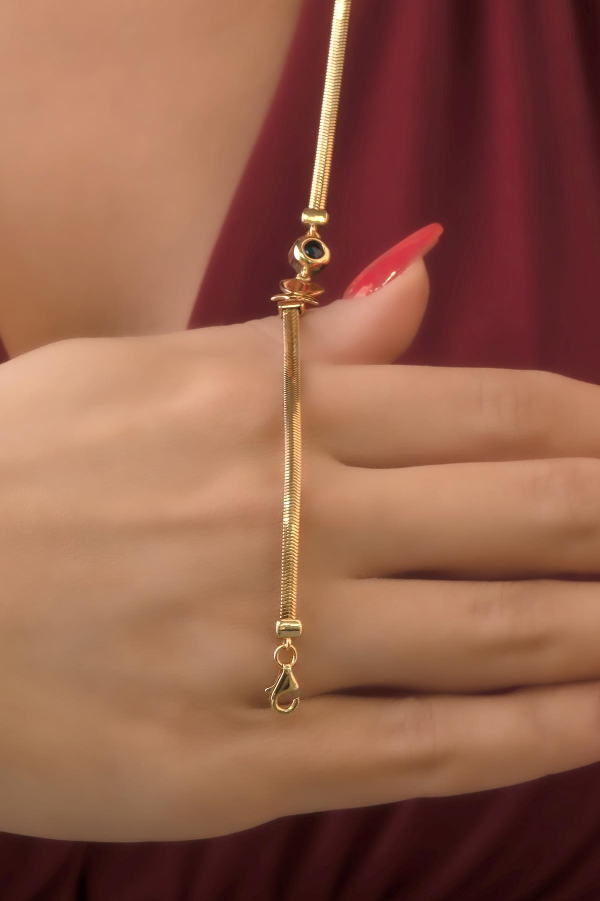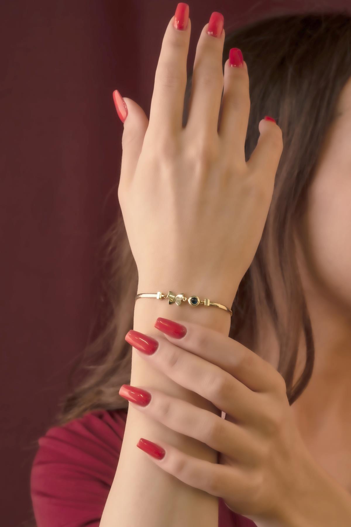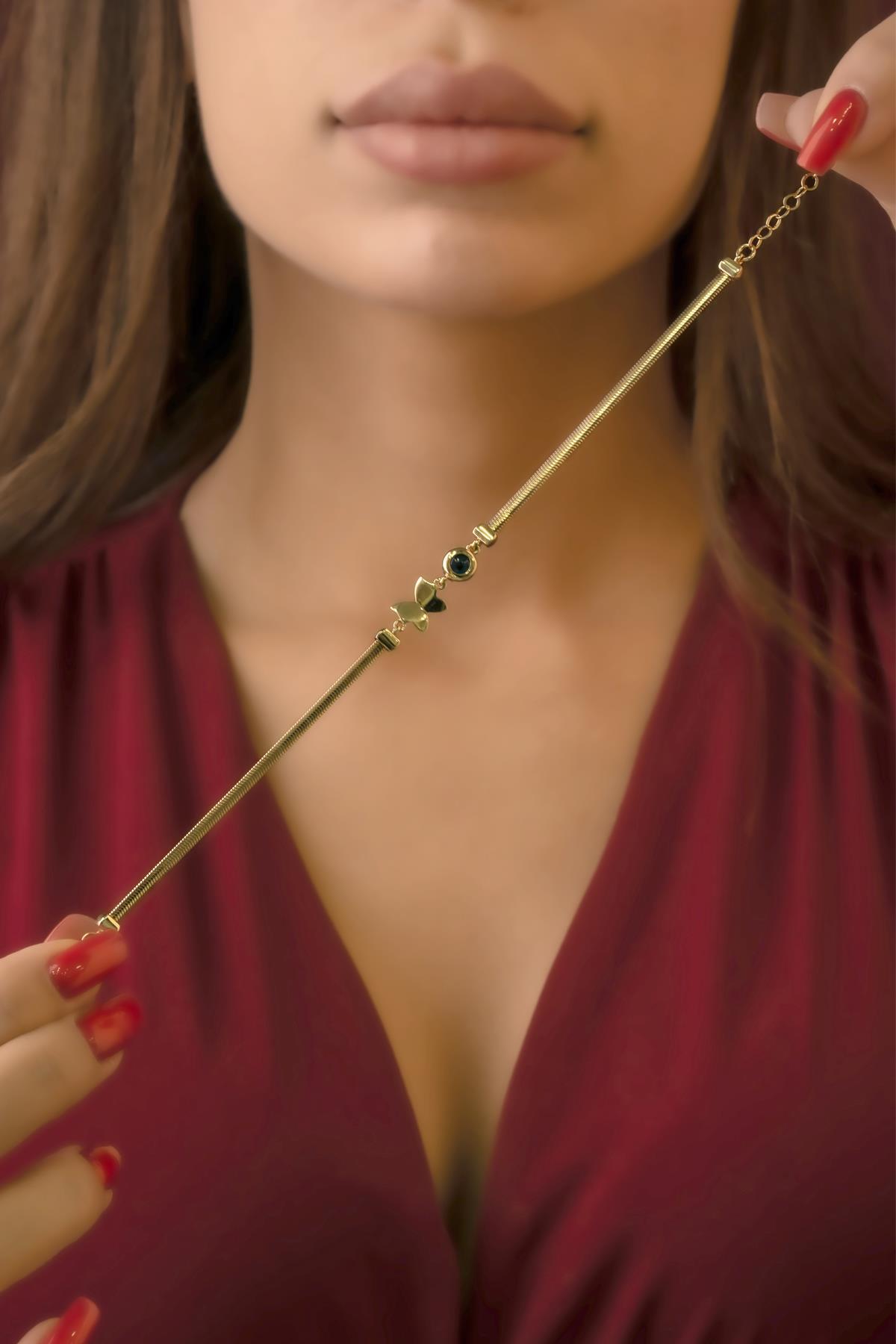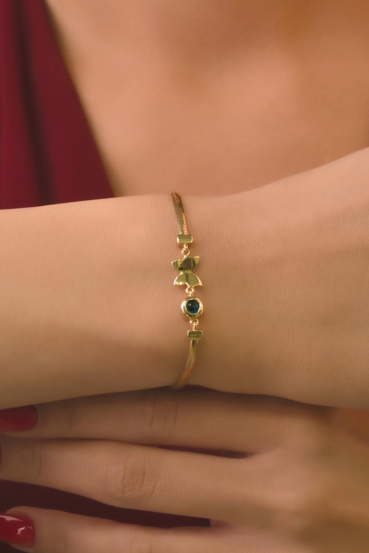 14 ayar altından İkra Kuyumculuk kalitesi ve işçiliği ile üretilen Kelebek ve Göz Detaylı Balıksırtı Bileklik, İtalyan balıksırtı (herringbone) zincirinin modern parlaklığını, zarif kelebek ve koruyucu nazar gözü figür detaylarıyla birleştirerek özgün ve anlamlı bir şıklık sunar. Bilekliğin zincir genişliği 2,45 mm ve figür (obje) genişliği 7,60 mm‘dir. Toplam uzunluğu 18 cm + 2 cm uzatma halkası sayesinde bileğe göre ayarlanabilir. Yaklaşık 4,75 gram ağırlığıyla günlük kullanıma uygundur. Belirtilen ağırlıkta (+/-) %10 değişiklik gösterebilir.
