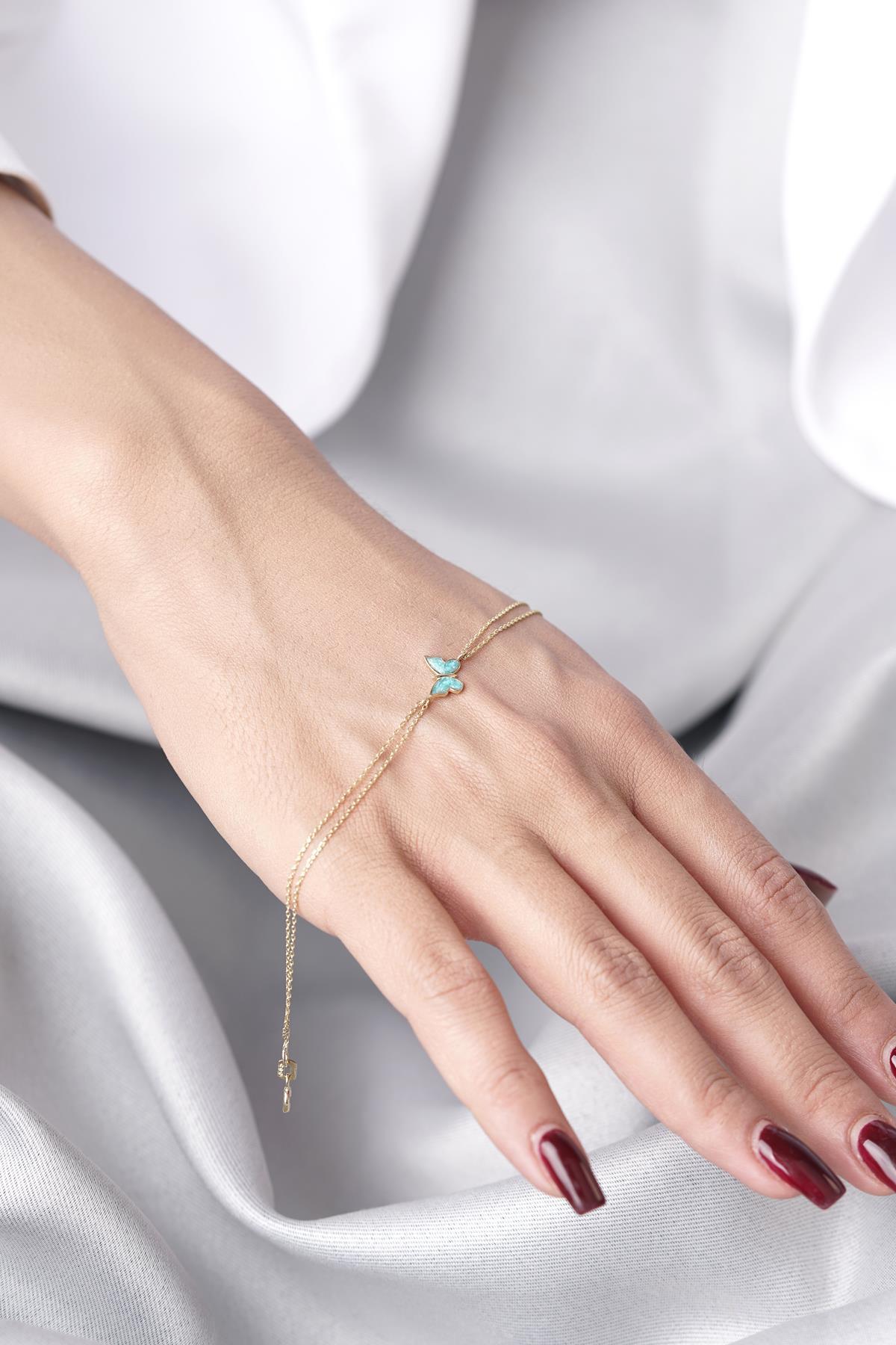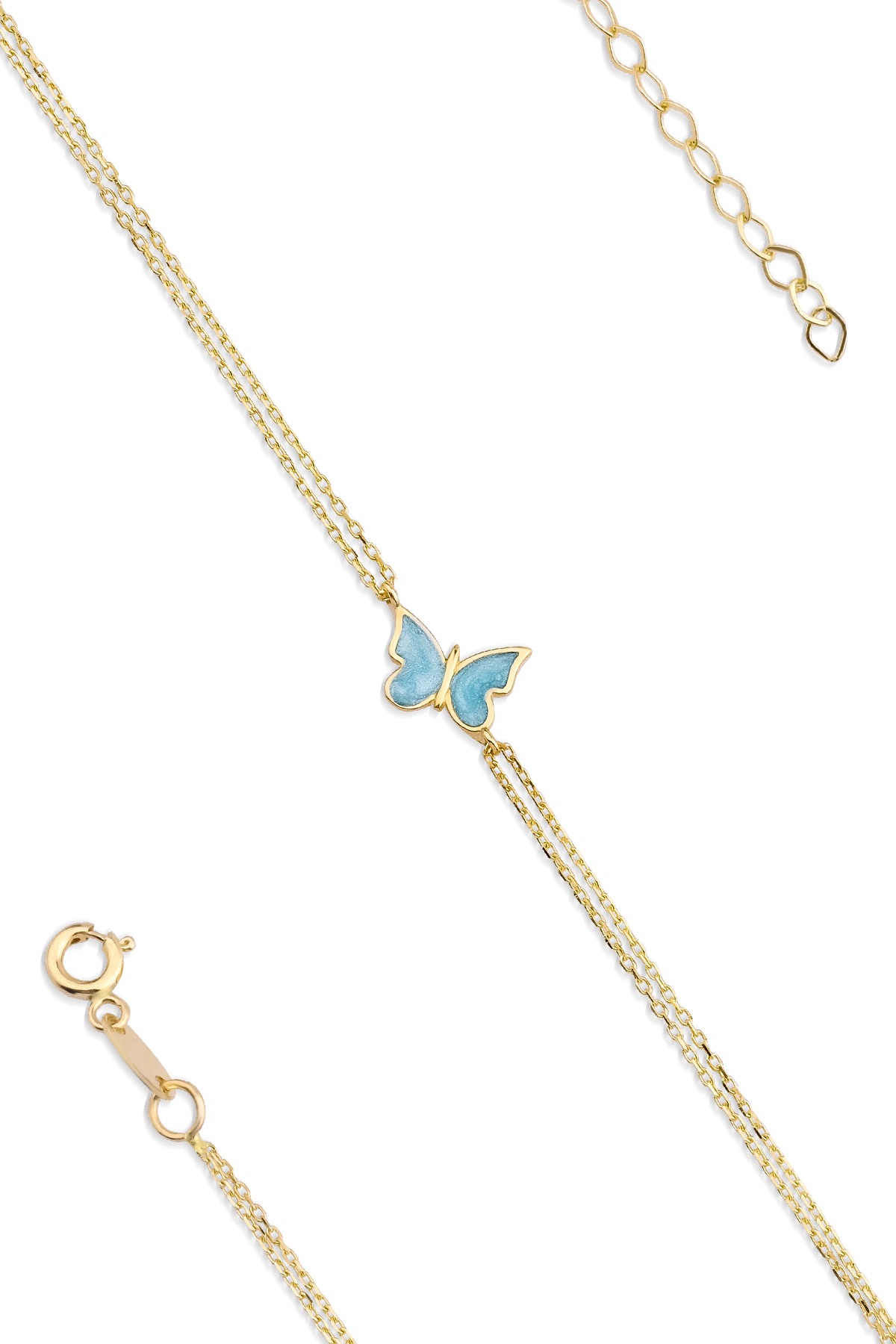 14 ayar altından İkra Kuyumculuk kalitesi ve işçiliği ile üretilen Mavi Mineli Kelebek Bileklik, zarif bir zincir üzerine yerleştirilmiş, kanatları canlı mavi mine ile renklendirilmiş narin Kelebek figürüne sahiptir. Kelebek figürünün genişliği 9,00 mm‘dir. Bilekliğin toplam uzunluğu 18 cm + 3 cm uzatma halkası sayesinde bileğe göre kolayca ayarlanabilir. Yaklaşık 1,24 gram ağırlığıyla hafif, zarif ve günlük kullanıma uygun bir parçadır.