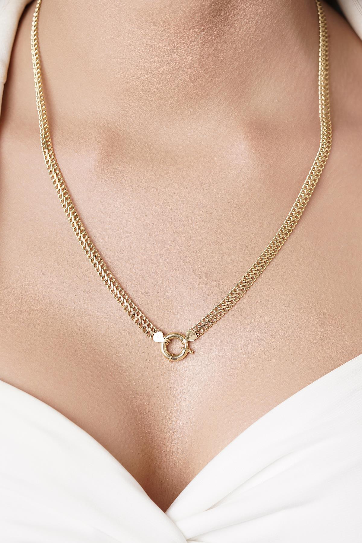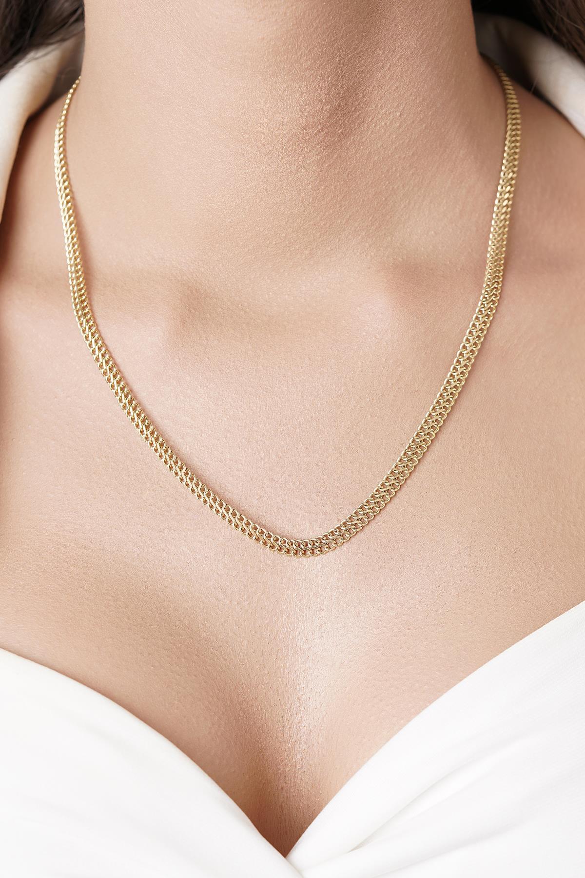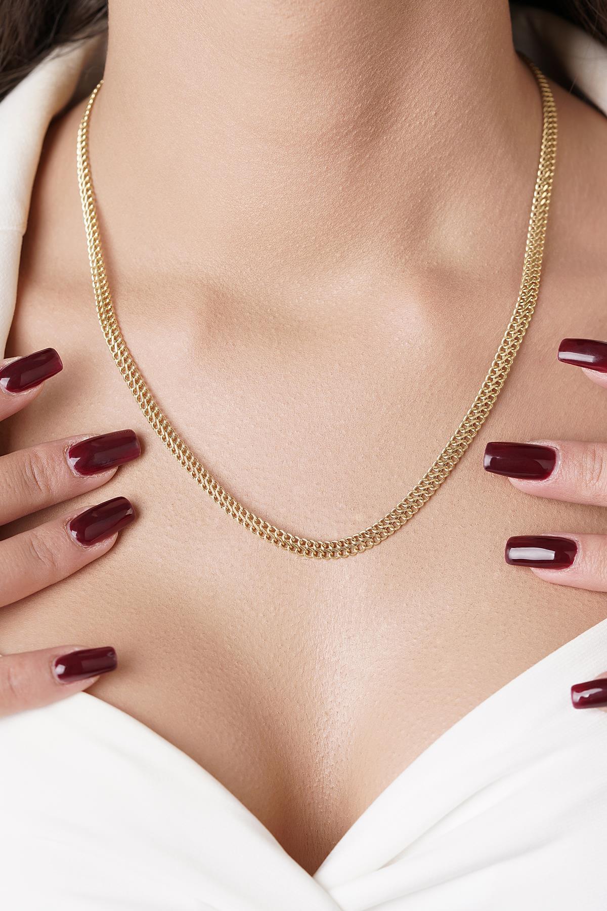 14 ayar altından İkra Kuyumculuk kalitesi ve işçiliği ile üretilen Otto Zincir, kalın ve modern halka yapısıyla dikkat çeken, iddialı bir zincir modelidir. 4,80 mm genişliğiyle belirgin ve tok bir duruş sergilerken, farklı uzunluk seçenekleriyle kişisel tercihlere uygundur. Yaklaşık ağırlıklar, seçilen uzunluğa göre değişmektedir. Bu kalın zincir, hem tek başına hem de gösterişli bir kolye ucuyla kullanılabilir.