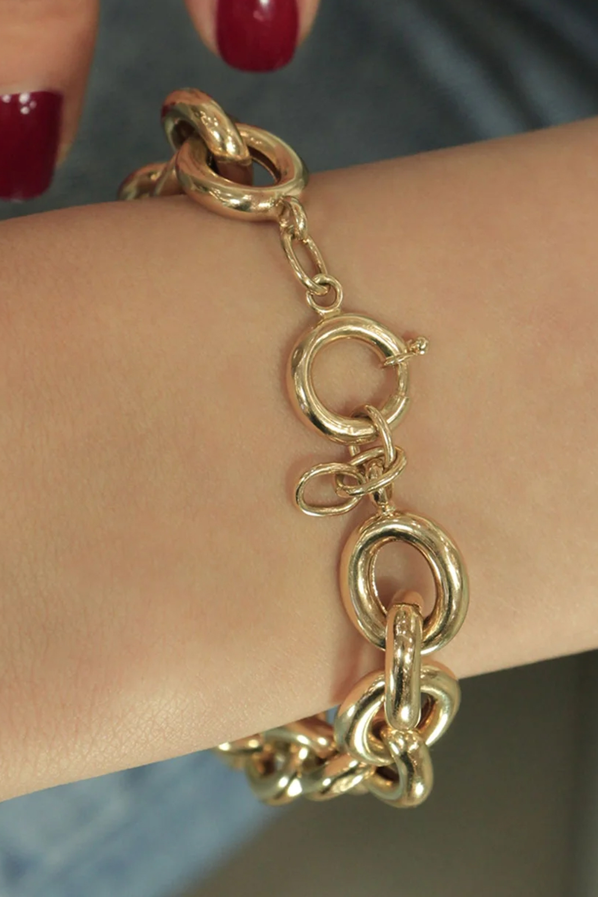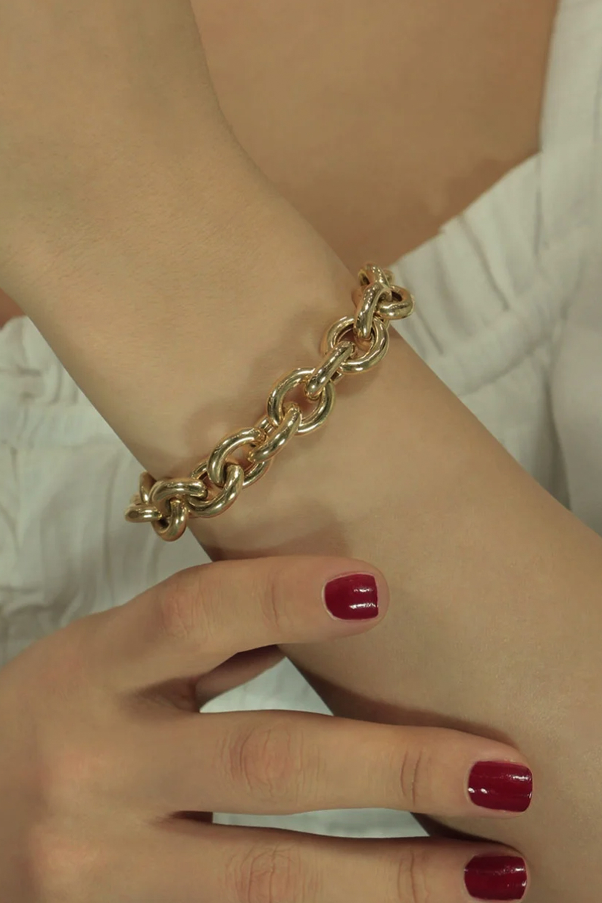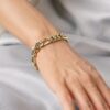 14 ayar altın bileklik, 22 cm uzunluğunda ve 22 gram ağırlığındadır. 1,5 cm oval halka dizilimiyle güçlü ve dikkat çekici bir görünüme sahiptir.