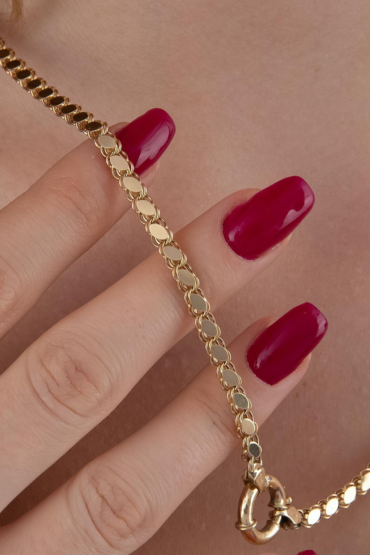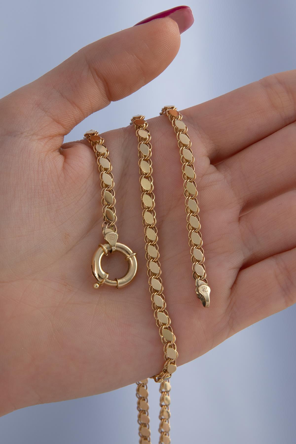 14 ayar altından İkra Kuyumculuk kalitesi ve işçiliği ile üretilen Pullu Zincir Kolye, zincir üzerine belirli aralıklarla yerleştirilmiş, yassı ve parlak pul detayları sayesinde ışığı yansıtan, modern ve göz alıcı bir modeldir. Zincir, 4 mm genişliğiyle belirgin ve dolgun bir duruş sergilerken, 60 cm uzunluğuyla uzun kullanıma ve katmanlamaya uygundur. Yaklaşık 11,07 gram ağırlığıyla tok, şık ve günlük kullanıma uygun bir parçadır.
