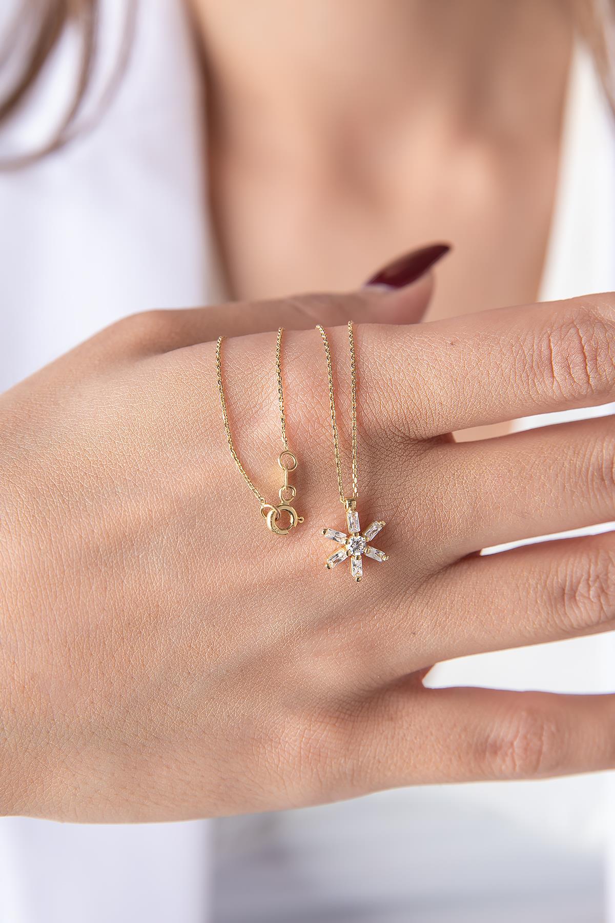 14 ayar altından İkra Kuyumculuk kalitesi ve işçiliği ile üretilen Taşlı Çiçek Motifli Kolye, doğanın zarafetini simgeleyen çiçek figürünü, merkezindeki ve yapraklarındaki parlak taşlar ile birleştirerek göz alıcı bir şıklık sunar. Kolye figürünün genişliği 1,06 cm, yüksekliği ise 1,30 cm‘dir. Zincir uzunluğu 42 cm olup, yaklaşık ağırlığı 1,94 gramdır ve günlük kullanıma uygundur.