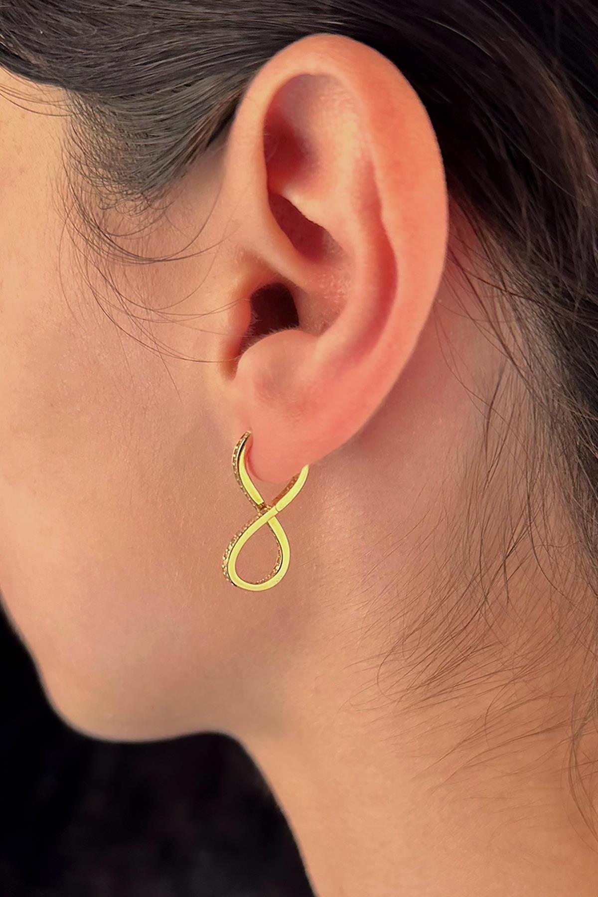 Taşlı sonsuzluk tasarımlı 14 Ayar altın küpe, hafif yapısı ile günlük kullanım için uygundur.