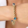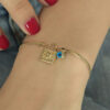 14 ayar altından İkra Kuyumculuk kalitesi ve işçiliği ile üretilen Tek Gözlü Doç Orta Boy Bileklik, modern Doç (Dok) zincir yapısını tek bir koruyucu nazar (göz) figürüyle birleştirerek zarif ve anlamlı bir tasarım sunar. Bilekliğin uzunluğu 19 cm olup, genişliği 5,30 mm‘dir. Yaklaşık 3,88 gram ağırlığıyla günlük kullanıma uygundur. Bileklikteki taşlar Zirkondur. Belirtilen ağırlıkta (+/-) %10 değişiklik gösterebilir.