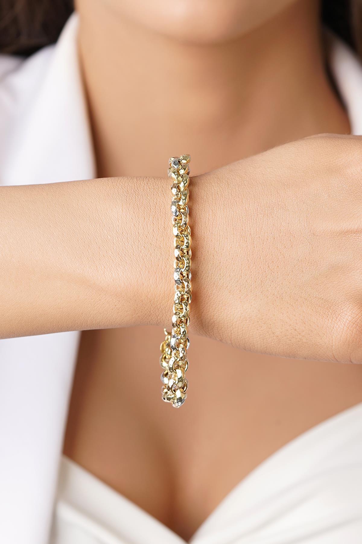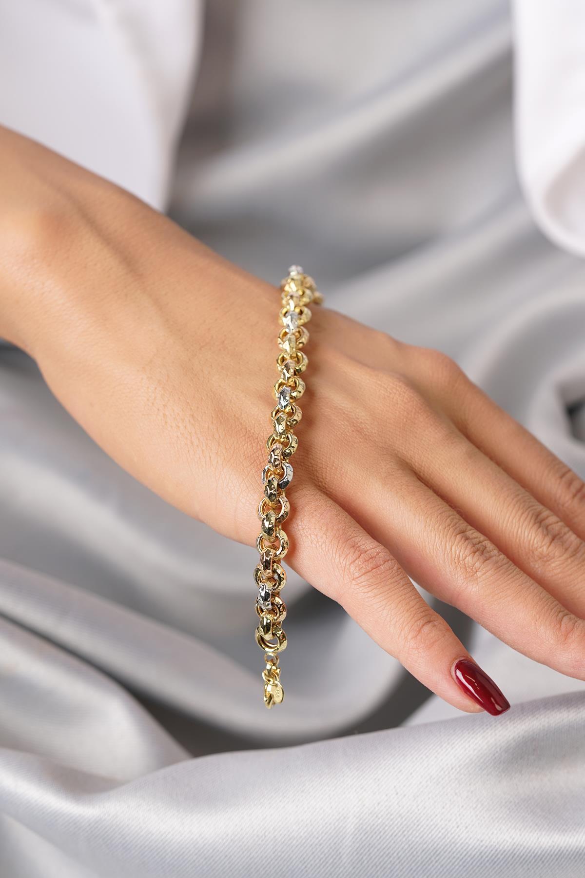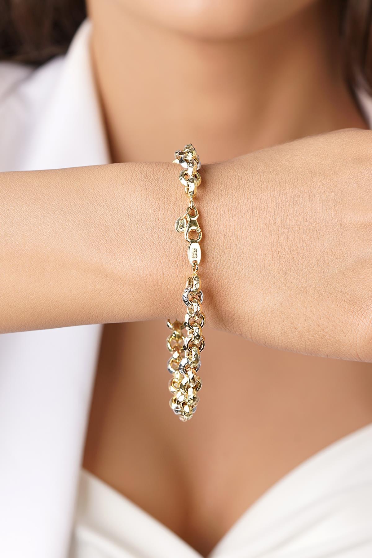 Güçlü duruşu ve zarif detaylarıyla dikkat çeken bu 14 Ayar Altın bileklik, 7.80 mm genişliği ve 14.38 gram ağırlığıyla modern erkek stiline sofistike bir dokunuş kazandırıyor. 22 cm uzunluğu sayesinde konforlu bir kullanım sunarken, zamansız tasarımıyla her ortamda şıklığınızı tamamlar.
