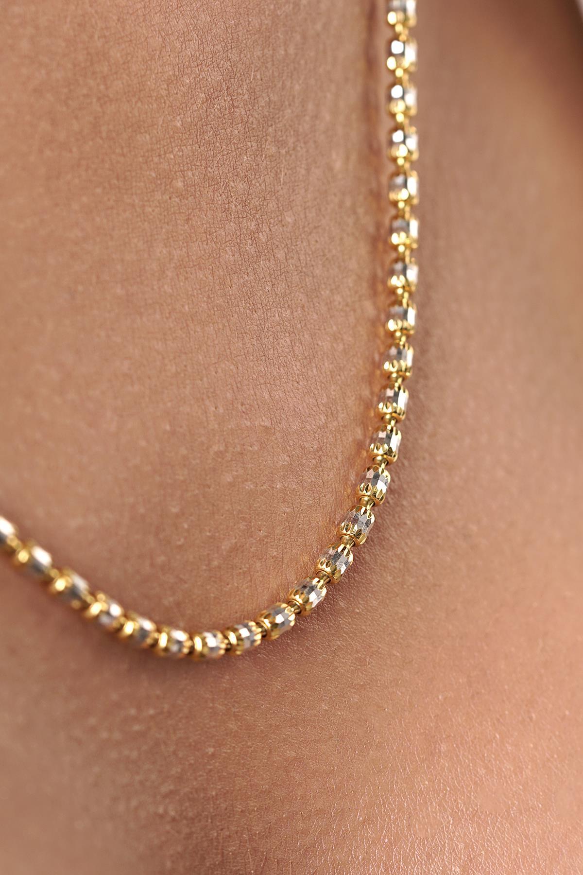 14 ayar altından İkra Kuyumculuk kalitesi ve işçiliği ile üretilen Teressa Kolye, zarif ve modern bir zincir modelidir. Taşsız olarak tasarlanmış bu model, 2,65 mm genişliğiyle narin bir duruş sergilerken, farklı uzunluk seçenekleriyle sunulmaktadır. Yaklaşık ağırlıklar uzunluğa göre değişmektedir.