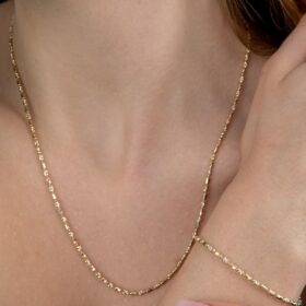 İkra Kuyumculuk imzasını taşıyan 14 Ayar Altın Teressa Set, sadeliğin ve gücün kusursuz birleşimini sunuyor. 2.65 mm genişliğindeki içi dolu yapısı, takıma hem dayanıklılık hem de prestijli bir duruş kazandırıyor. Taşsız tasarımı sayesinde altının saf ışıltısını ön plana çıkaran bu set, modern zincir dokusuyla zamansız bir şıklık vadediyor.