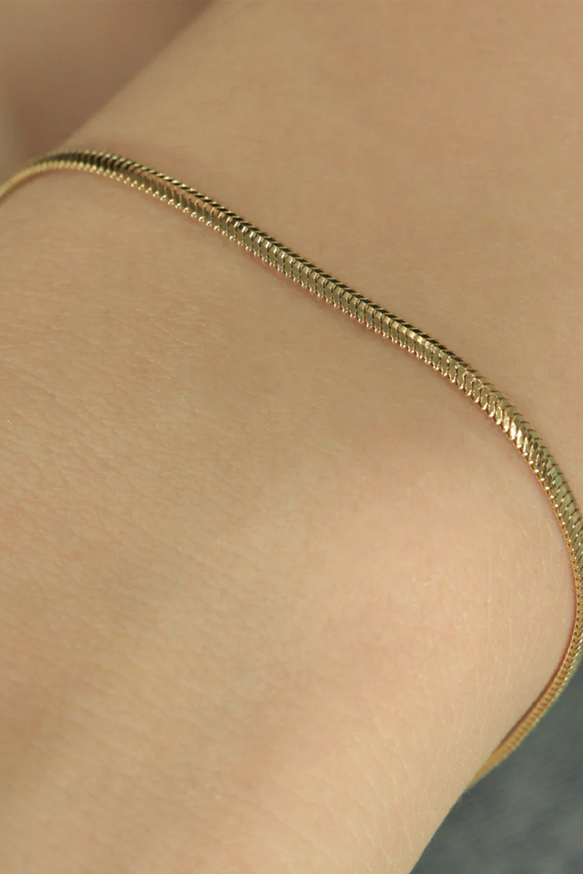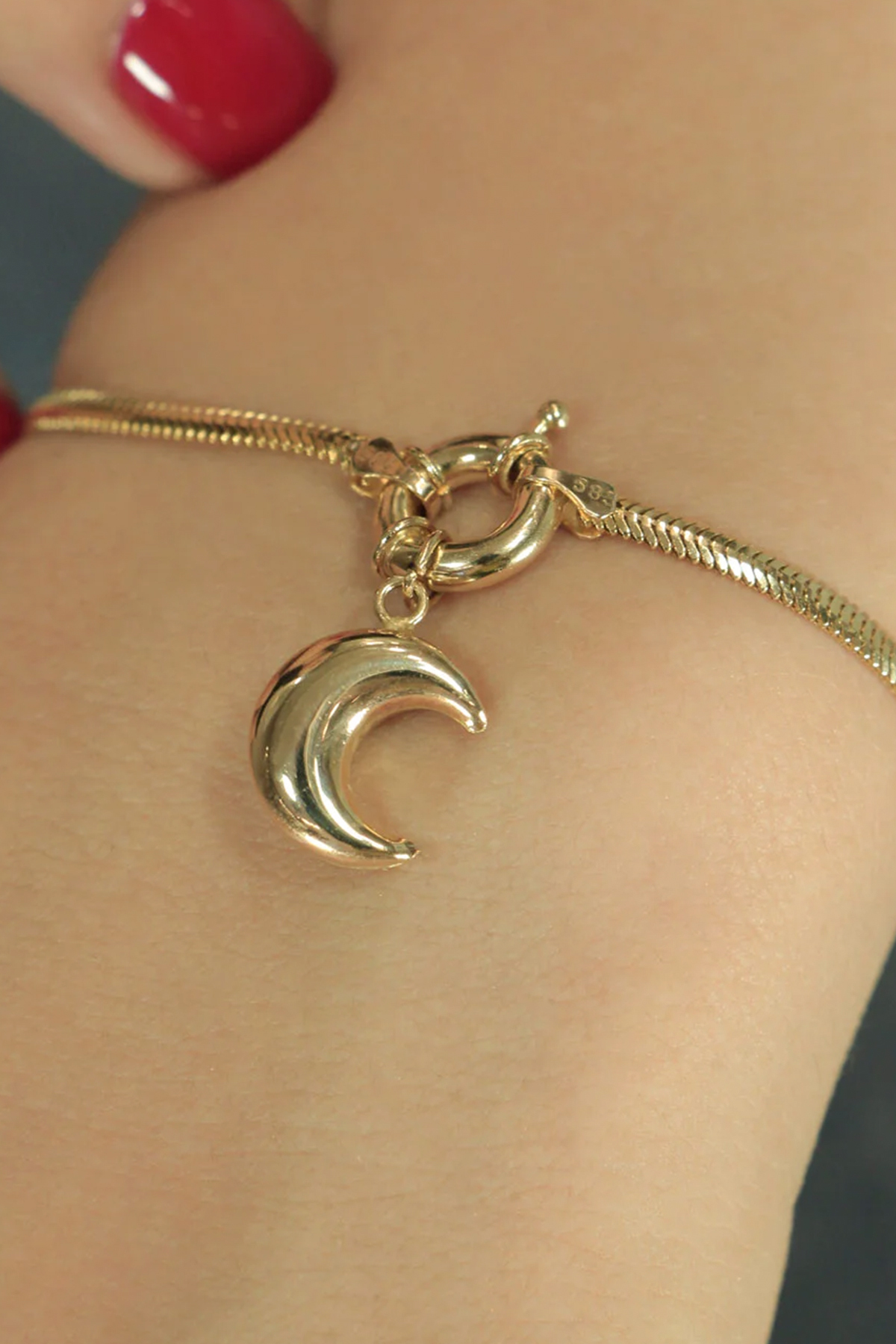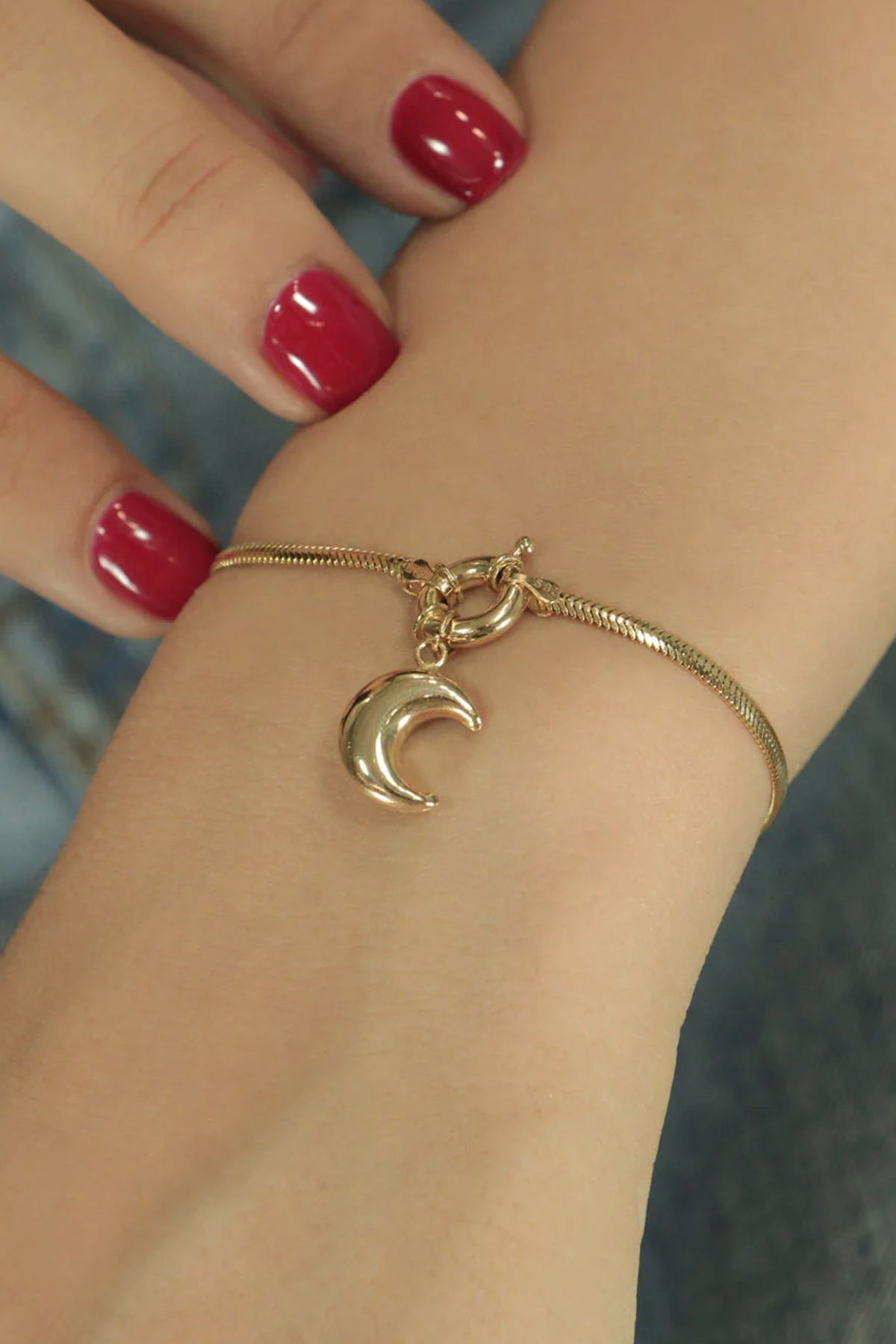 14 ayar altından İkra Kuyumculuk kalitesi ve işçiliği ile üretilen Tombul Ay Detaylı Balıksırtı Bileklik, parlak ve akışkan balıksırtı (herringbone) zincirini, dolgun ve zarif Ay figürü detayıyla tamamlayarak modern ve mistik bir şıklık sunar. Bilekliğin zincir genişliği 2,50 mm ve toplam uzunluğu 18 cm‘dir. Yaklaşık 3,43 gram ağırlığıyla günlük kullanıma uygun, hafif ve dikkat çekici bir parçadır. Belirtilen ağırlıkta (+/-) %10 değişiklik gösterebilir.
