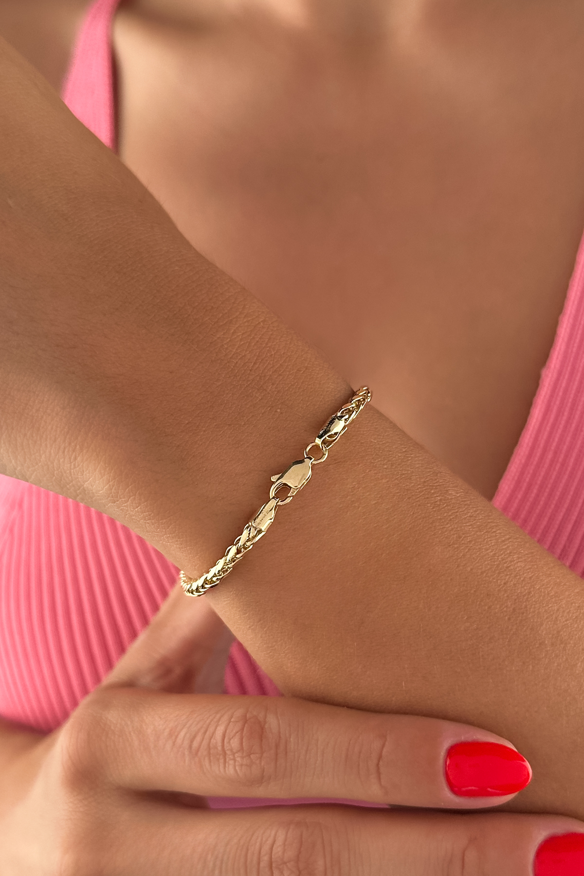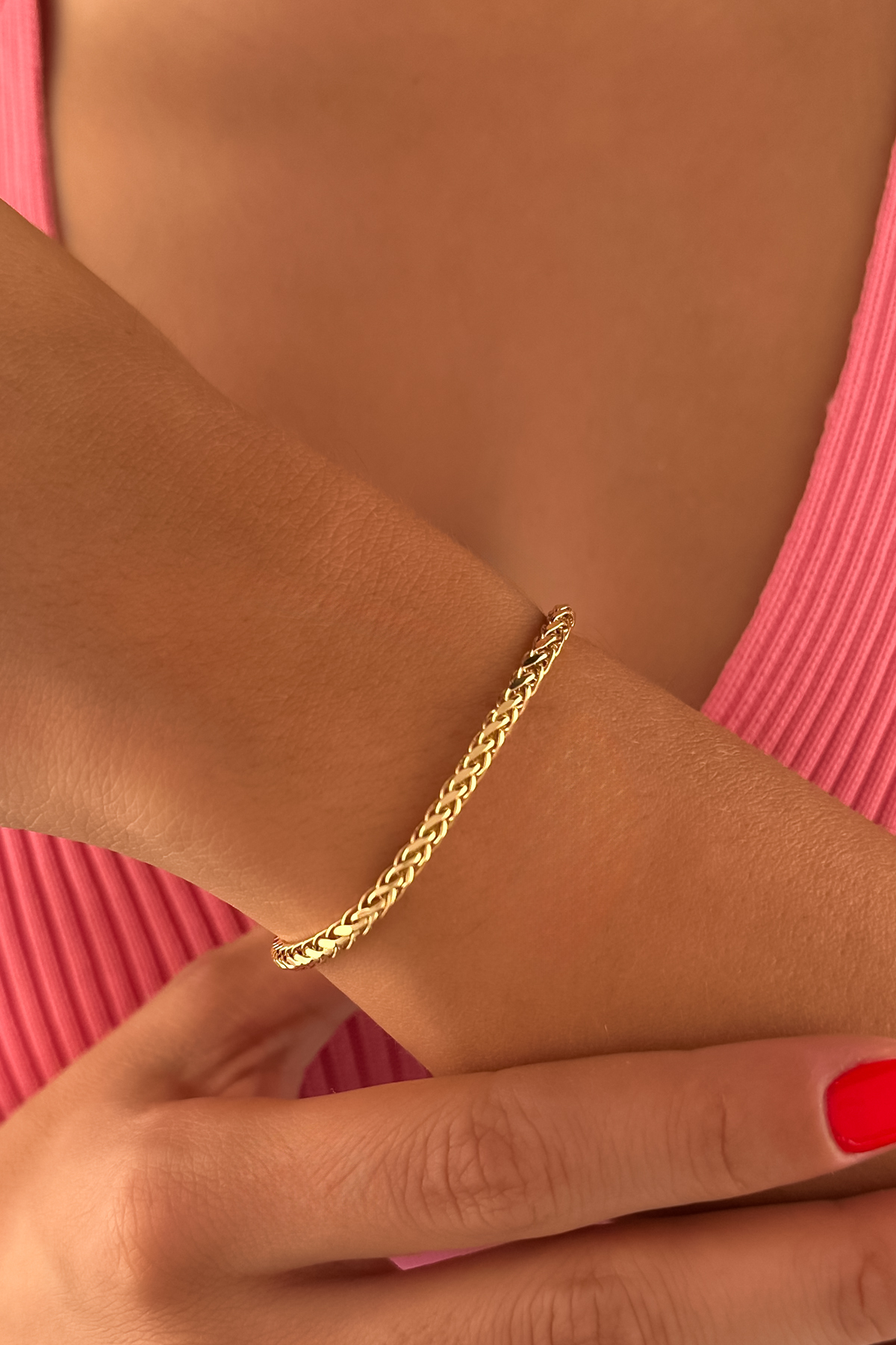 Göz alıcı zarafetiyle öne çıkan bu 14 ayar altın bileklik, hafif yapısı ve ince işçiliğiyle modern çizgiyi yakalıyor.