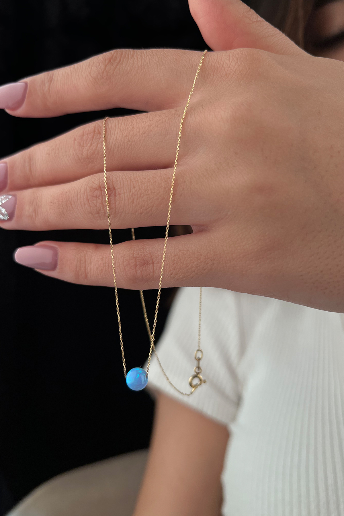 14 ayar altından üretilen Turkuaz Opal Kolye, yaklaşık 1,30 gram ağırlığında ve 42 cm uzunluğundadır. Turkuaz renkli opal taşıyla dikkat çeken bu zarif kolye, 1 yıl garantilidir.
