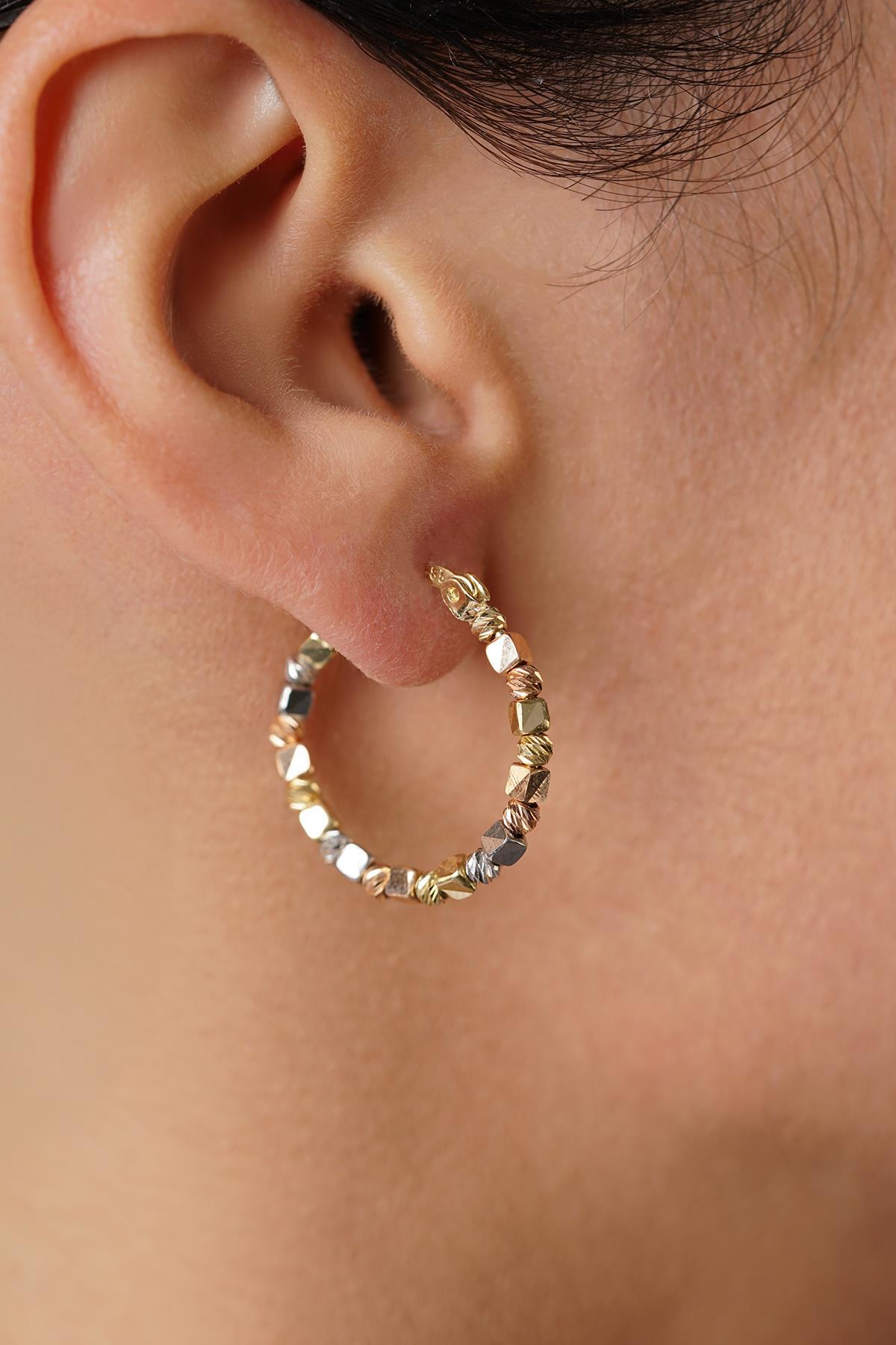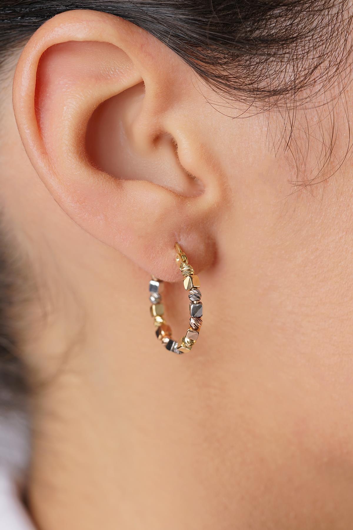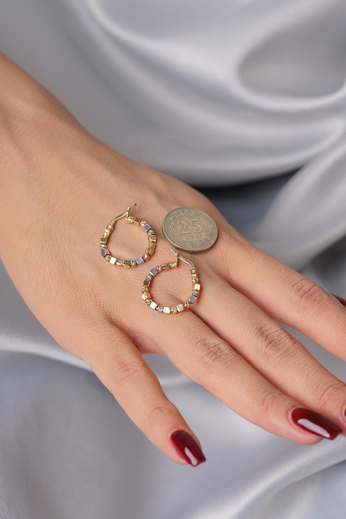 14 ayar altından İkra Kuyumculuk kalitesi ve işçiliği ile üretilen Üç Renkli Dorika Küp Halka Küpe, halka formunda olup, yüzeyinde sarı, beyaz ve kırmızı/pembe altın renklerini barındıran üç renkli tasarımıyla dikkat çeker. Bu renkler, küpe üzerinde Dorika (top/boncuk) veya küp şeklinde detaylarla birleştirilmiştir. Bu sayede canlı ve modern bir görünüm sunar. Küpenin çapı 2,10 cm ve kalınlığı 2,35 mm‘dir. Ürünün yaklaşık çift ağırlığı 3,38 gramdır. Tüm küpe modellerimiz çift olarak gönderilmektedir ve günlük kullanıma uygundur.