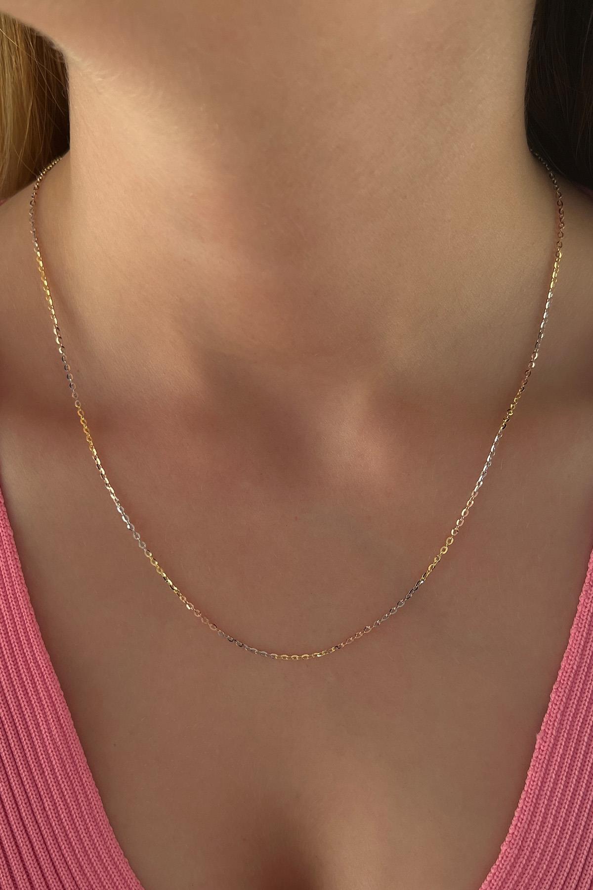 14 ayar altından İkra Kuyumculuk kalitesi ve işçiliği ile üretilen Üç Renkli Forse Zincir, klasik Forse (Fizyon) zincir modelinin Sarı, Beyaz ve Rose altın renklerini bir arada barındıran modern ve dinamik bir versiyonudur. Zincir, 1,00 mm genişliğiyle oldukça ince ve narin bir duruş sergilerken, farklı uzunluk seçenekleriyle kişisel tercihlere uygundur. Hafif yapısıyla günlük kullanıma idealdir.