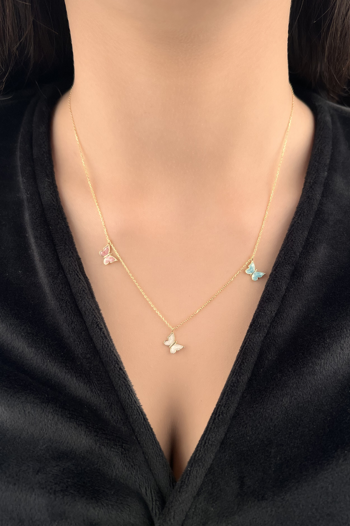 Üç renkli kelebek kolye, farklı altın renklerinin birleşimi ve kelebek figürü ile dikkat çekiyor.