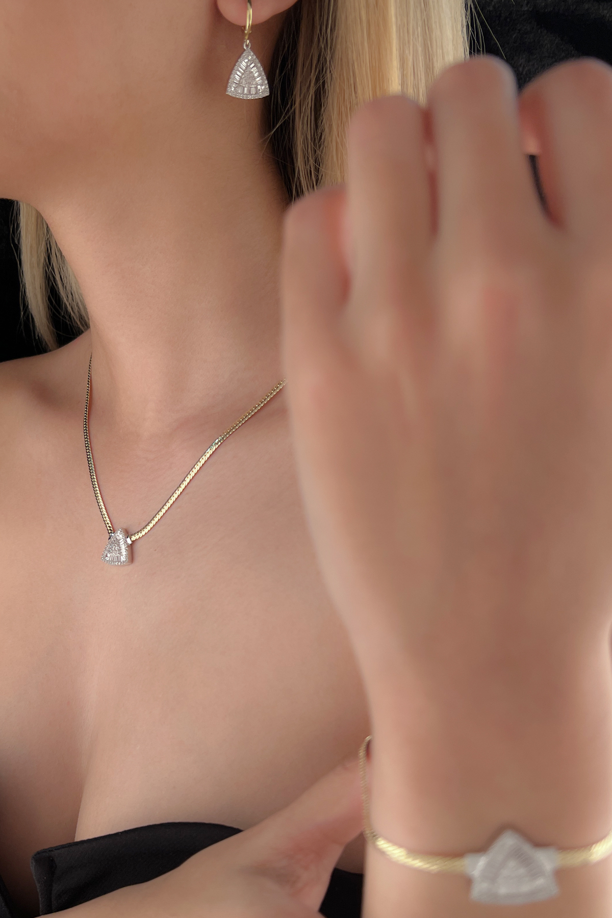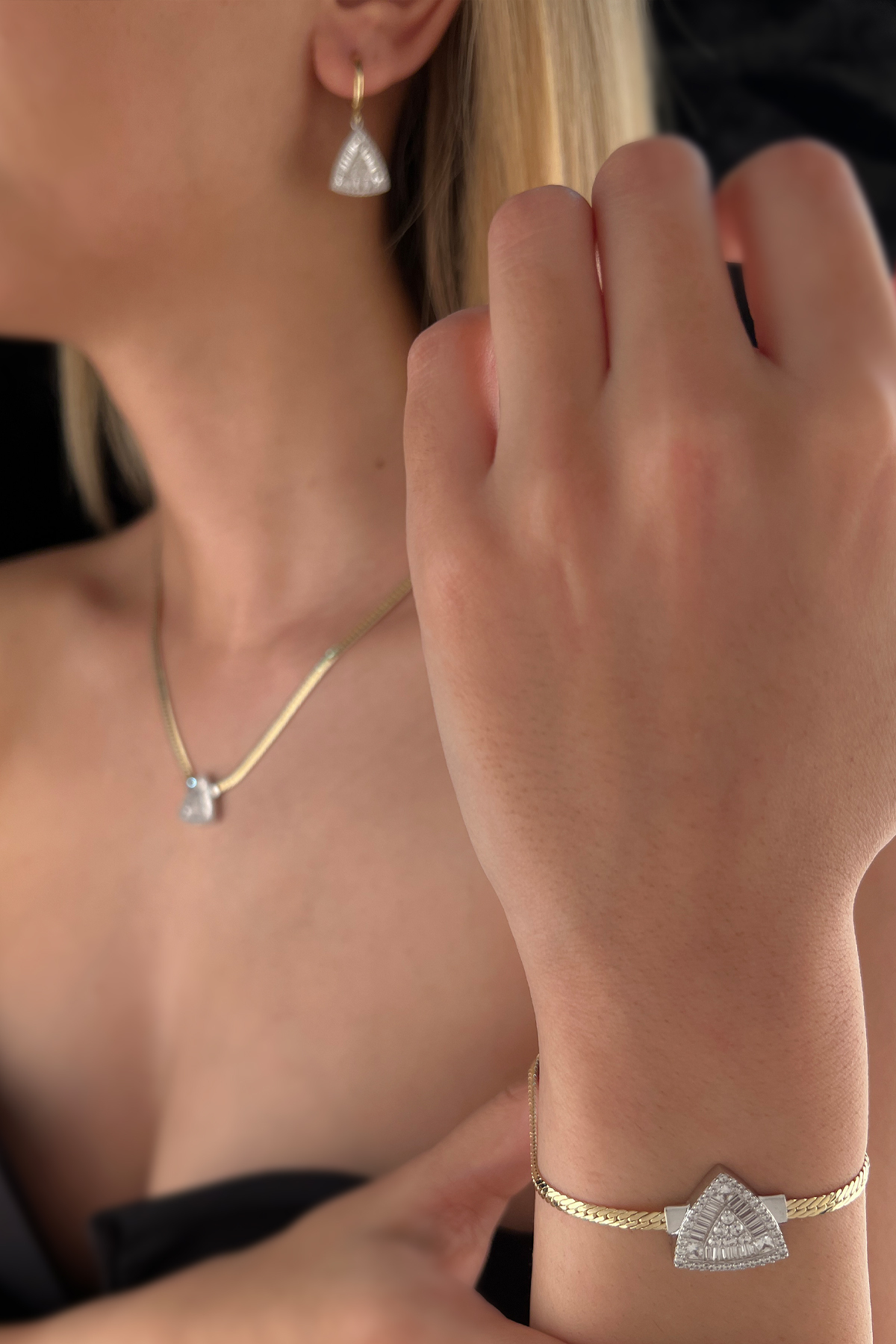 14 Ayar Altın Üçgen Baget Set (Kolye, Bileklik, Küpe)