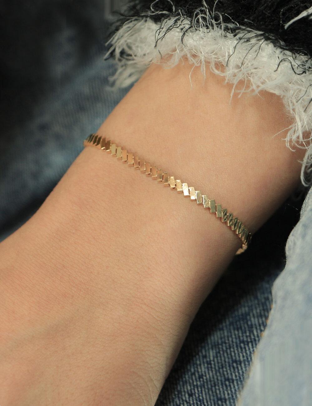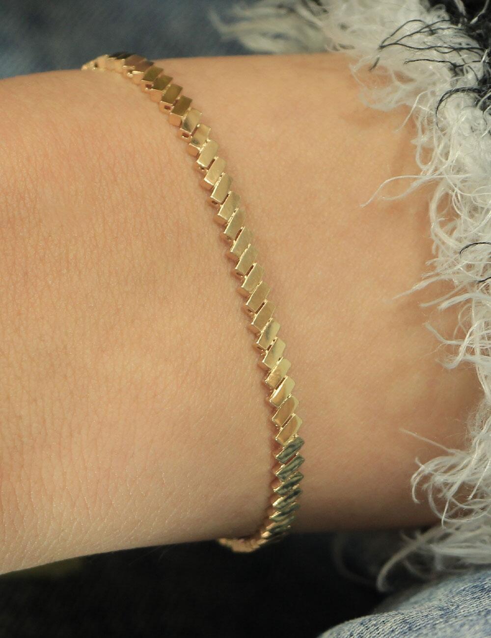 14 Ayar Altın Yapışık Dikdörtgenler Bileklik, özgün bağlantı formu ve dikkat çekici geometrik dizaynıyla öne çıkar. 14 ayar altın yapısı, dayanıklılığı ve estetik görünümü bir araya getirir. Günlük kullanıma uygun olan bu model, sade çizgilerle güçlü bir stil algısı oluşturur.