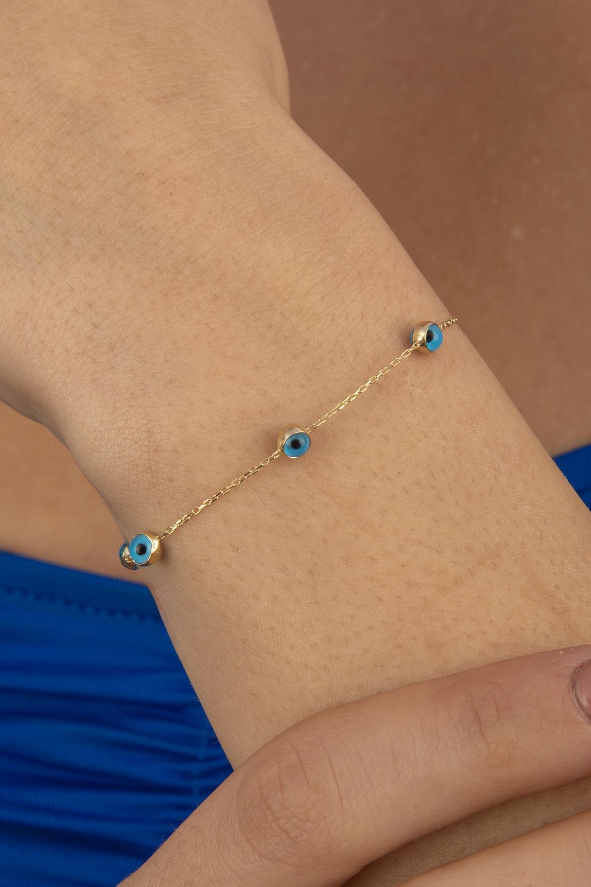 14 ayar altından İkra Kuyumculuk kalitesi ve işçiliği ile üretilen Yedi Göz Detaylı Bileklik, yedi adet koruyucu nazar (göz) figürüyle şans ve korunma temalarını zarif bir biçimde birleştirir. Bilekliğin uzunluğu 19 cm‘dir. Yaklaşık 1,33 gram ağırlığıyla son derece hafif ve narin yapısıyla günlük kullanıma uygundur. Belirtilen ağırlıkta (+/-) %10 değişiklik gösterebilir.