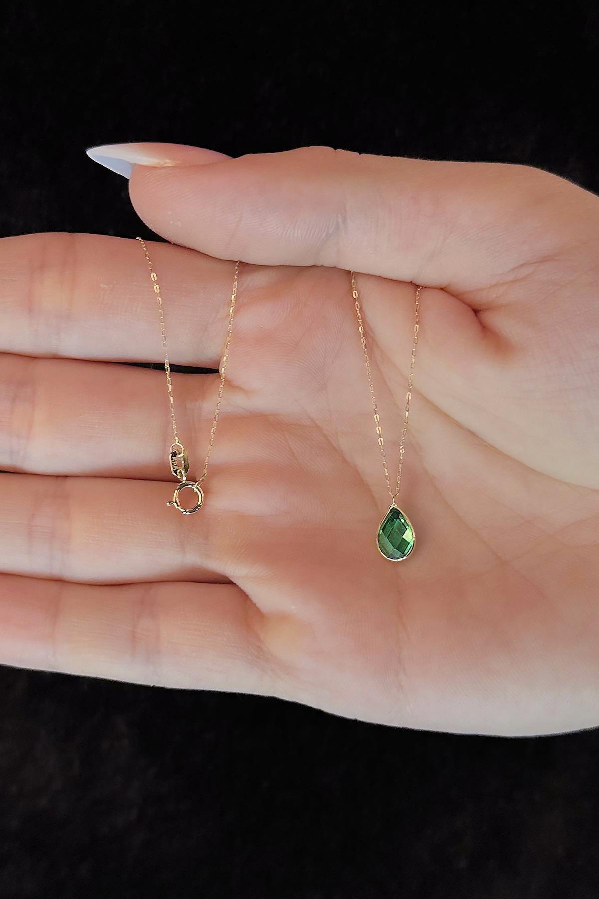 14 ayar altından İkra Kuyumculuk kalitesi ve işçiliği ile üretilen Zümrüt Taşlı Damla Kolye, klasik ve zarif damla (gözyaşı) formundaki uca yerleştirilmiş göz alıcı Zümrüt taşı ile tasarlanmış şık bir modeldir. Ürünün yaklaşık ağırlığı 0,96 gramdır.