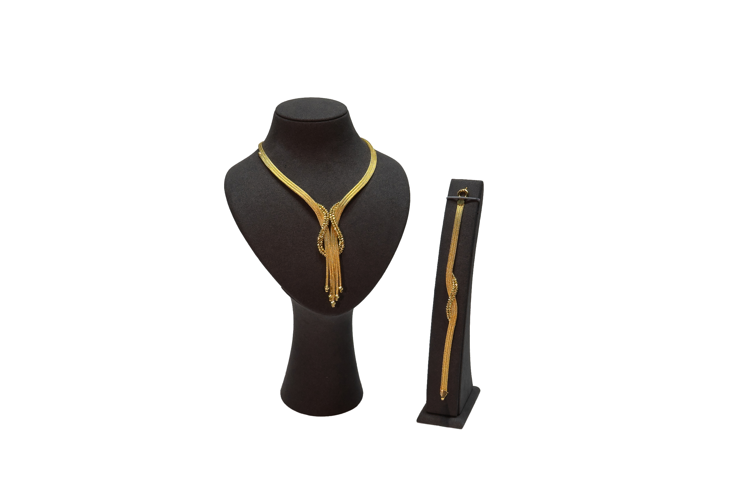 Maden: ALTIN | Ayar: 14 | Toplam Ağırlık: 31,47 Gr | Kolye: 22,27 Gr | Bileklik: 9,20 Gr | Tasarım: DÜĞÜMLÜ SAMANYOLU PÜSKÜLLÜ