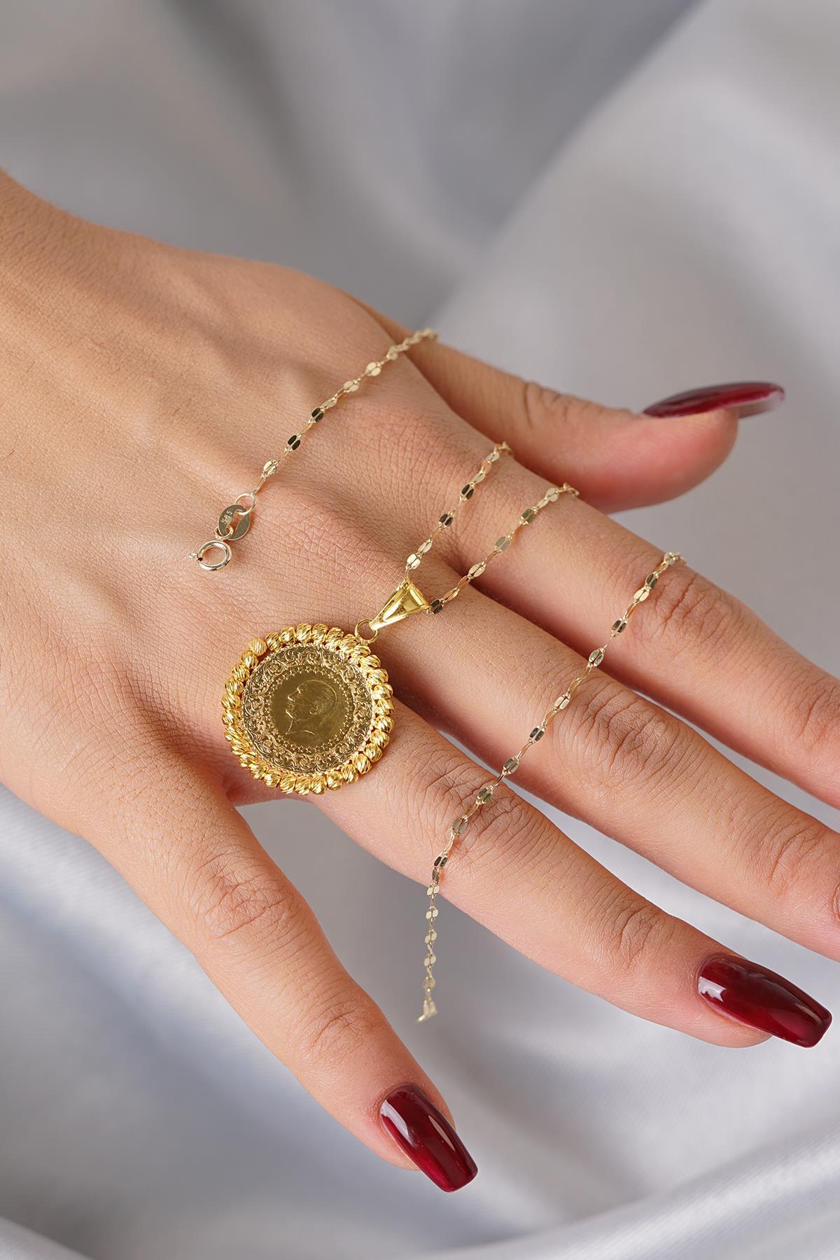 Bu model, 22 Ayar çeyrek altın ucu ile 14 Ayar aynalı zincirin birleştiği yüksek değer algısı sunan özel bir tasarımdır. Aynalı yüzey yapısına sahip zincir formu, ışığı güçlü şekilde yansıtarak kolyeye sofistike bir parlaklık kazandırır.