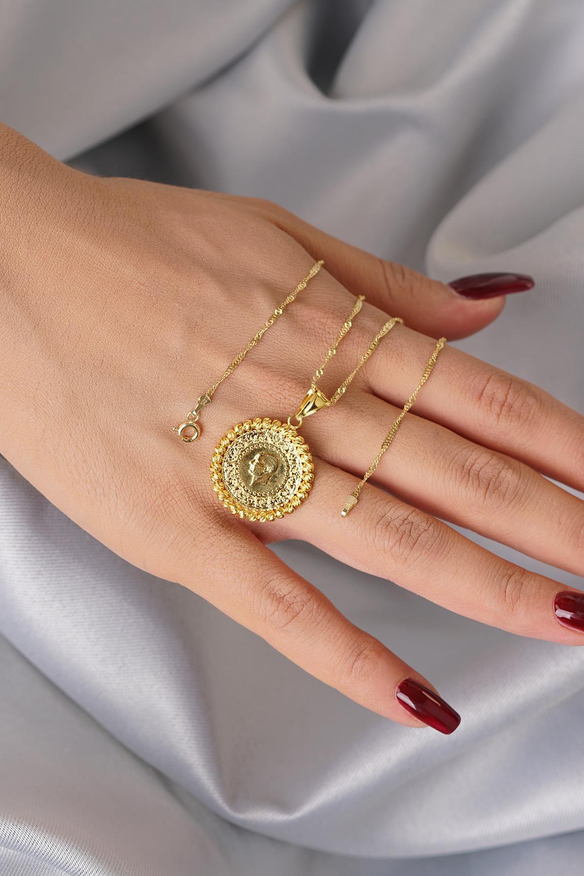 Bu kolye, üzerinde 22 Ayar çeyrek altın ucu ve 14 Ayar altın singapur zincir ile tasarlanmıştır. Zincir uzunluğu 45 cm’den 70 cm’e kadar değişen seçeneklerle sunulmakta, her boyun çizgisine uyum sağlamaktadır. Zincir genişliği 1.40 mm, altın ucu genişliği ise 2.28 cm’dir.