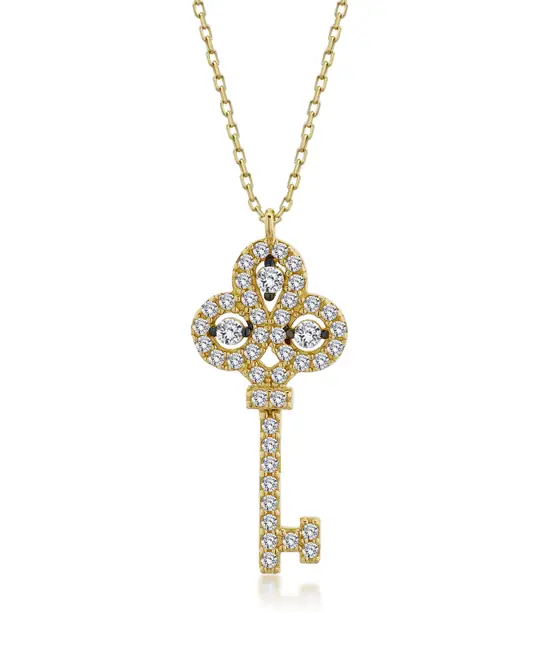 İkra Kuyumculuk koleksiyonuna ait bu Altın Anahtar Kolye, yeni başlangıçları simgeleyen anahtar formunu çiçek detaylı taş işlemeleriyle 14 ayar altın kalitesinde sunar. 2.48 gram ağırlığındaki estetik yapısı ve 42-45 cm aralığındaki ayarlanabilir zincir uzunluğuyla boynunuzda zarif bir duruş sergiler.