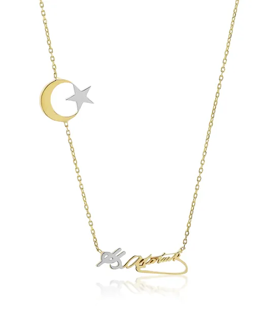 İkra Kuyumculuk koleksiyonuna ait bu Altın Atatürk İmzalı Ay Yıldız Kolye, milli değerlerimizi ve estetiği 14 ayar altın kalitesiyle bir araya getiriyor. 2.36 gram ağırlığındaki bu anlamlı tasarım, ay yıldız figürünü Atatürk’ün imzasıyla buluşturarak hem şık hem de manevi değeri yüksek bir aksesuar sunar.