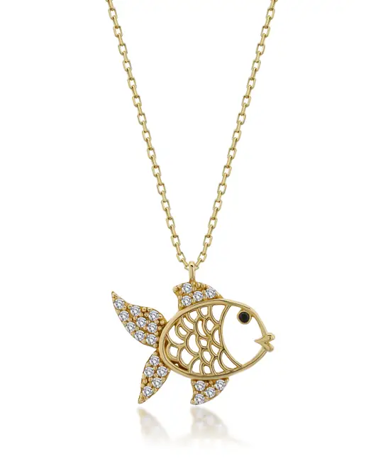 İkra Kuyumculuk koleksiyonuna ait bu Altın Balık Kolye, ışıltılı taşlarla işlenmiş balık figürünü ve göz kısmındaki karakteristik detayları 14 ayar altın kalitesiyle sunar. 2.26 gram ağırlığındaki estetik yapısı ve 42-45 cm aralığındaki ayarlanabilir zincir uzunluğuyla boynunuzda zarif bir duruş sergiler.