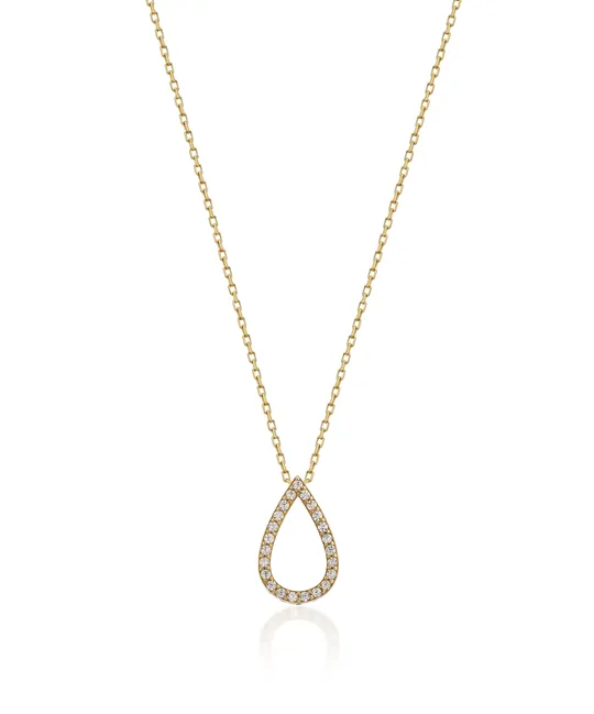 İkra Kuyumculuk koleksiyonuna ait bu Altın Damla Kolye, klasik damla formunu parıltılı taşlı çerçeve detaylarıyla 14 ayar altın kalitesinde sunar. 1.56 gram ağırlığındaki narin yapısı ve 42-45 cm aralığındaki ayarlanabilir zincir uzunluğuyla boynunuzda zarif bir duruş sergiler.