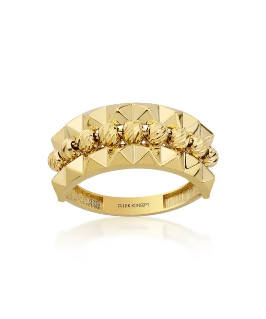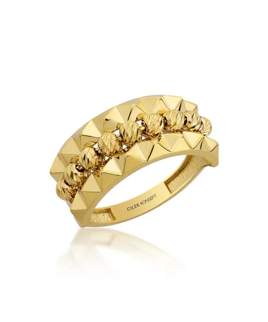 Altın Dorika Yüzük, dorika formundaki altın detaylarıyla altın yüzük kategorisinde dokulu bir yüzey kurgusu sunar. Dorika parçalar, yüzük çevresinde düzenli bir dizilim oluşturarak form bütünlüğünü destekler. Yüzük gövdesi, parmak üzerinde dengeli bir oturum sağlayacak şekilde yapılandırılmıştır.