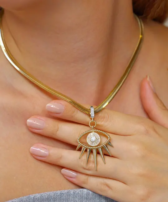 Altın Göz Kolye Ucu, koruyucu anlamıyla bilinen göz sembolünü merkezine alan, sembolik değeri yüksek bir altın kolye ucu modelidir. Tasarım formu, sembolün net algılanmasını sağlayacak şekilde yapılandırılmış; yüzey işçiliğinde 14 ayar altının doğal parlaklığı dengeli biçimde öne çıkarılmıştır.