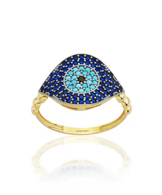 İkra Kuyumculuk koleksiyonuna ait bu Altın Göz Lacivert Taşlı Yüzük, göz figürünün koruyucu sembolizmini lacivert taşın asil rengi ve 14 ayar altın kalitesiyle buluşturuyor. 2.13 gram ağırlığındaki zarif tasarımı, parmağınızda modern bir duruş sergilerken gün boyu konforlu bir kullanım sunar.
