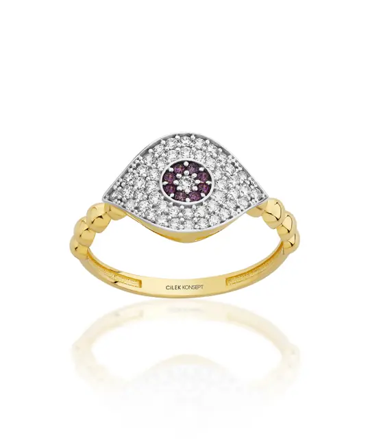 İkra Kuyumculuk koleksiyonuna ait bu Altın Göz Mor Taşlı Yüzük, göz figürünün koruyucu sembolizmini mor taşın enerjisi ve 14 ayar altın kalitesiyle birleştirir. 1.86 gram ağırlığındaki zarif ve hafif yapısı, parmağınızda modern bir duruş sergilerken gün boyu konforlu bir kullanım sunar.